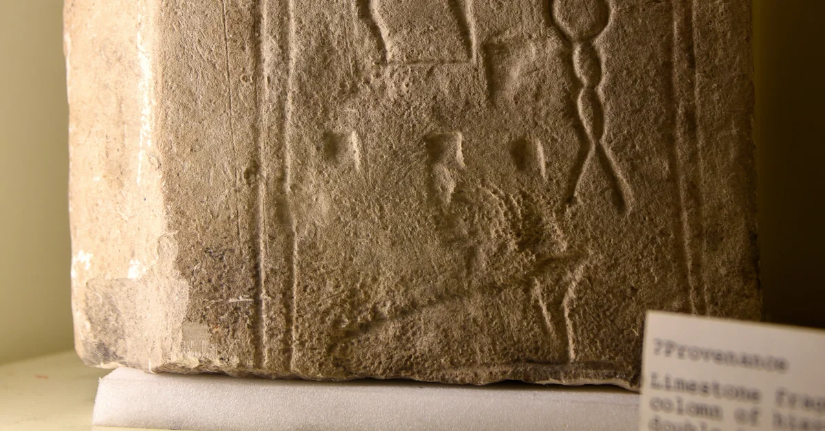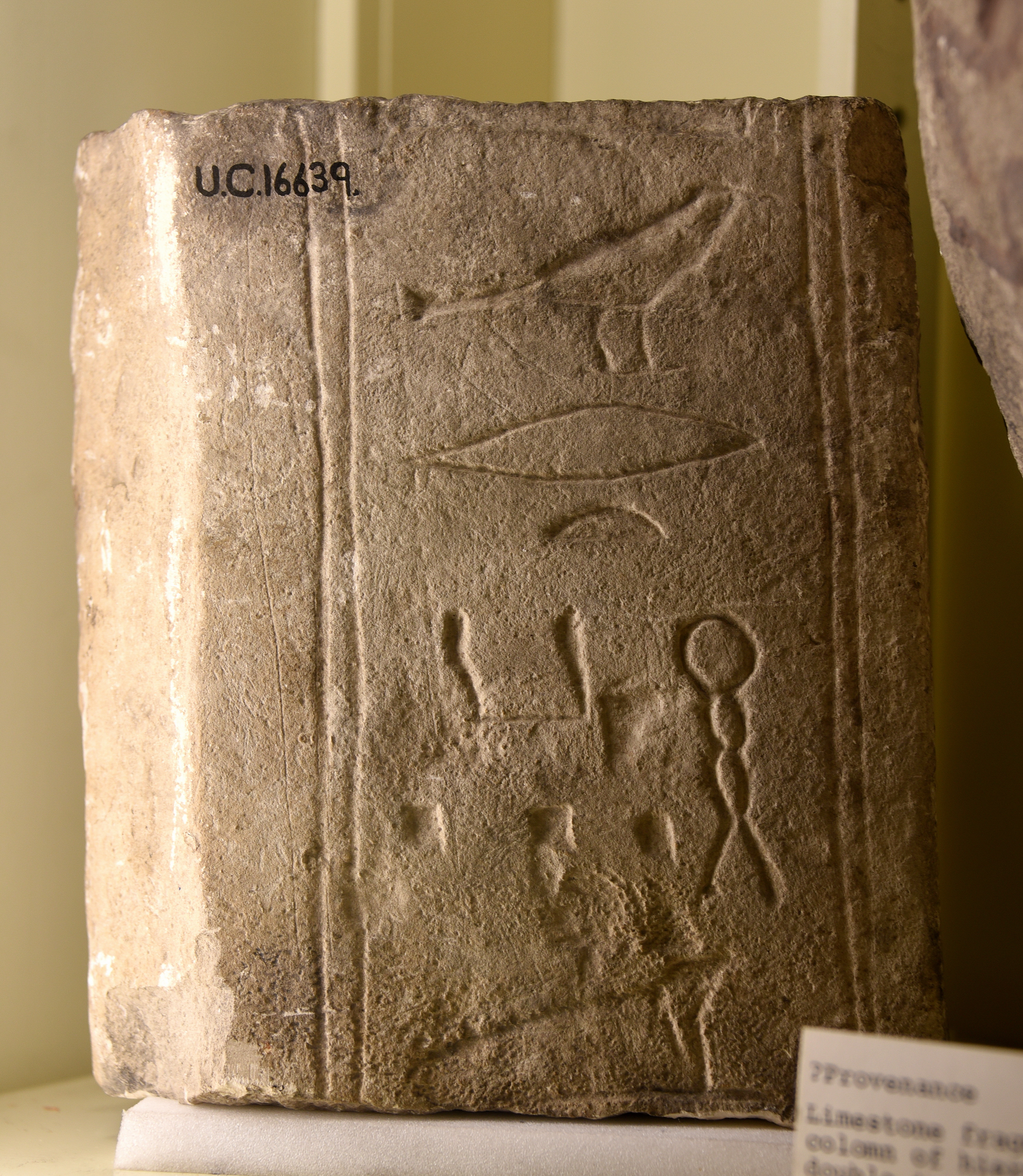 The hieroglyphic inscriptions (between double incised lines) on this limestone fragment reads "great lady of magic SEBEK". From Al-Faiyum (Fayum), Egypt. Unknown date. Unpublished. The Petrie Museum of Egyptian Archaeology, London (With thanks to The Petrie Museum of Egyptian Archaeology, UCL).