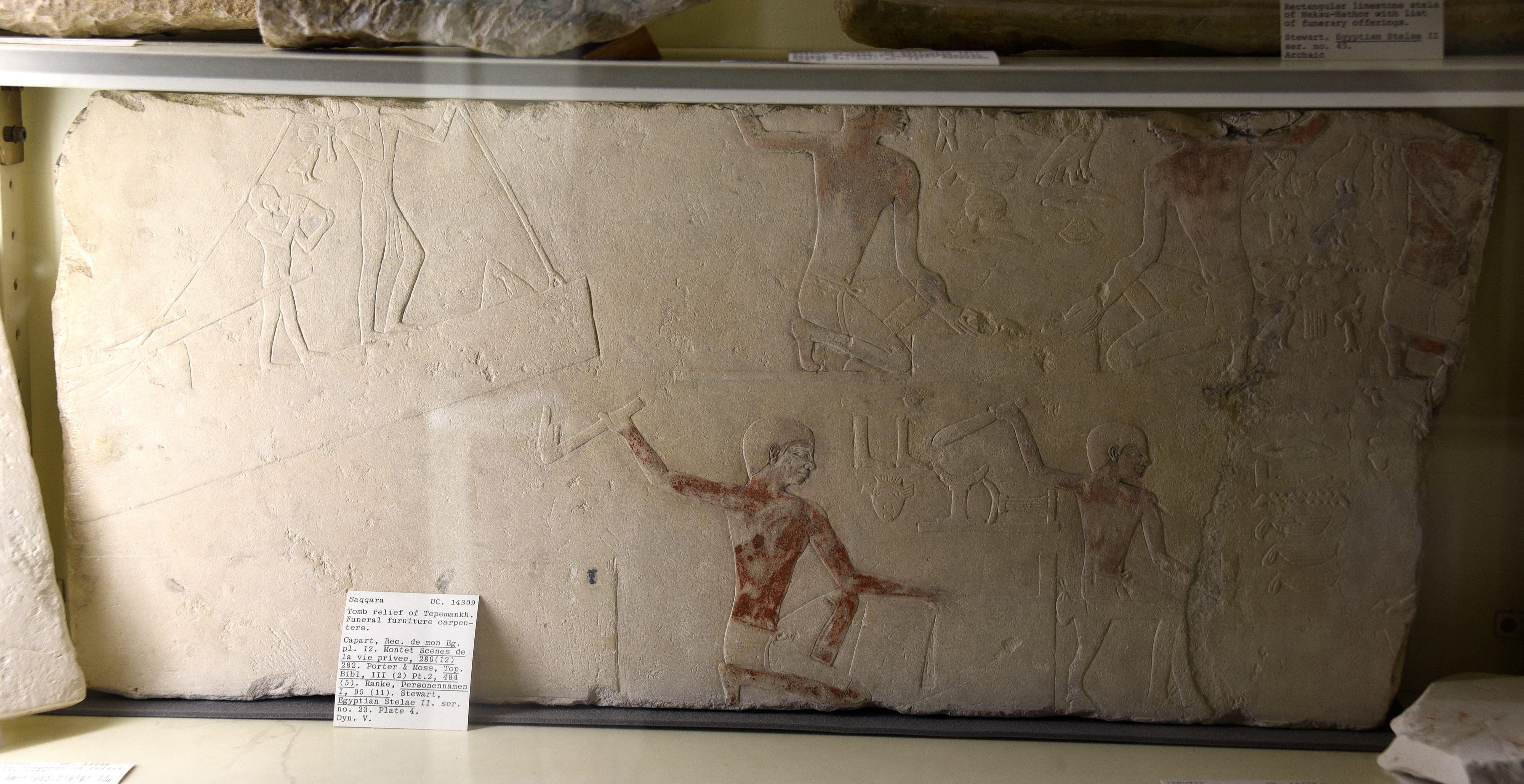 This limestone fragment shows carpenters making funeral furniture at a quayside. The block came from a wall of the dismantled mastaba tomb-chapel of Tepemankh (Djadjamankh). From Saqqara, Egypt. 5th Dynasty, 2494 to 2345 BCE. The Petrie Museum of Egyptian Archaeology, London (With thanks to The Petrie Museum of Egyptian Archaeology, UCL).