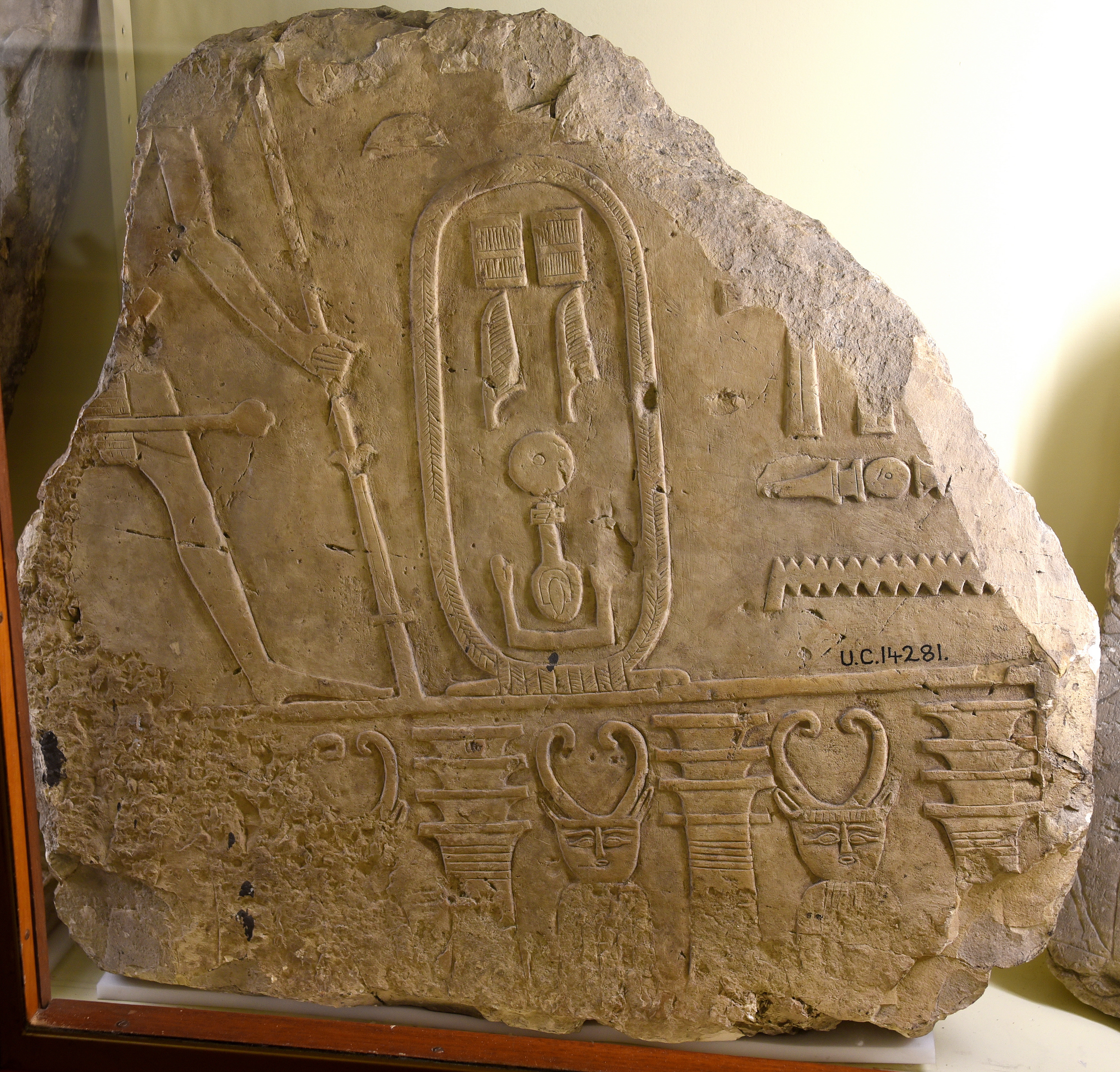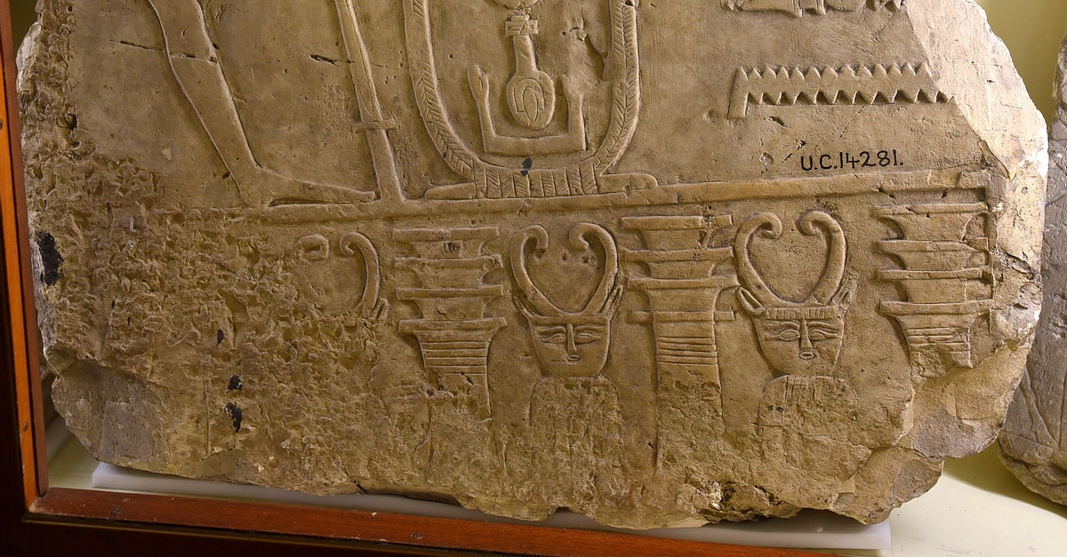 This limestone slab was found beneath the sand of the Ptolemaic temple at Kopyos (Qift). At the left side, the figure of the king Pepi II looks to the right. Before him, the rope-border cartouche containing the birth-name and throne-name of the king (Pepy Neferkara) appears. Below, we can see a frieze of djed pillar signs alternating with girdle ties of Isis (each surmounted by Hathor head). From Koptos, Egypt. Old Kingdom, 6th Dynasty, 23rd century BCE. The Petrie Museum of Egyptian Archaeology, London (With thanks to The Petrie Museum of Egyptian Archaeology, UCL).