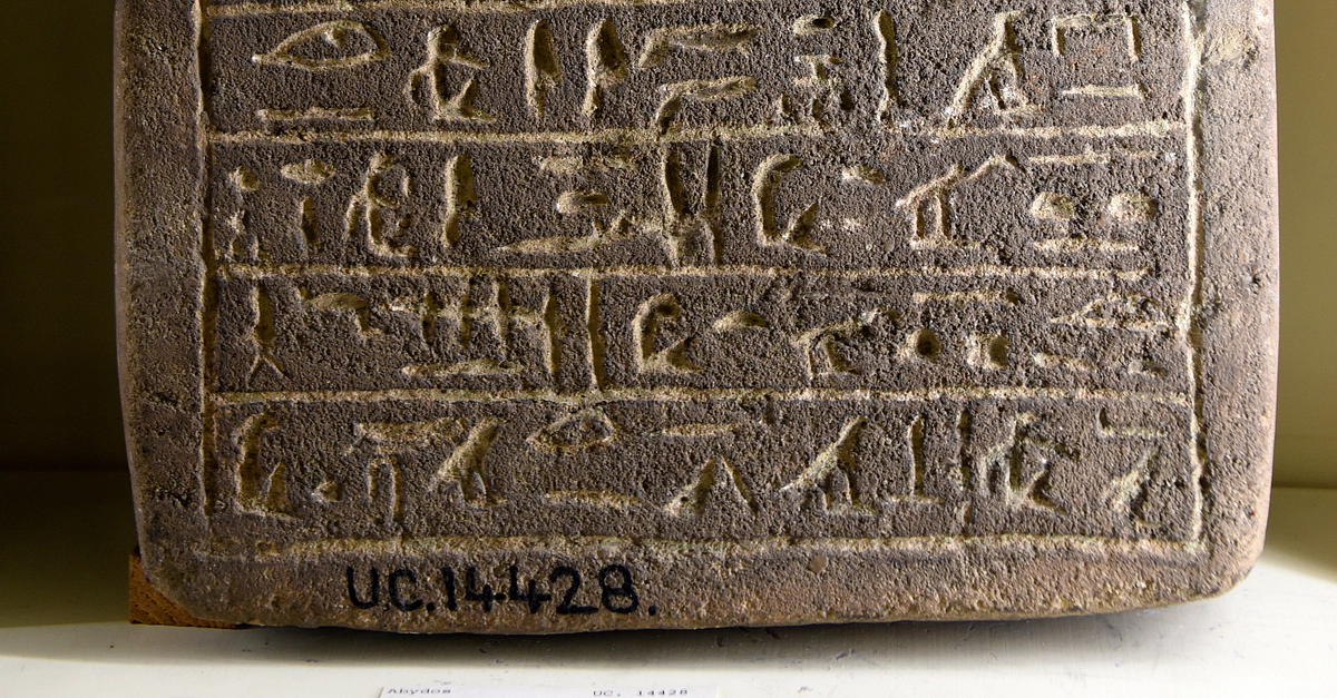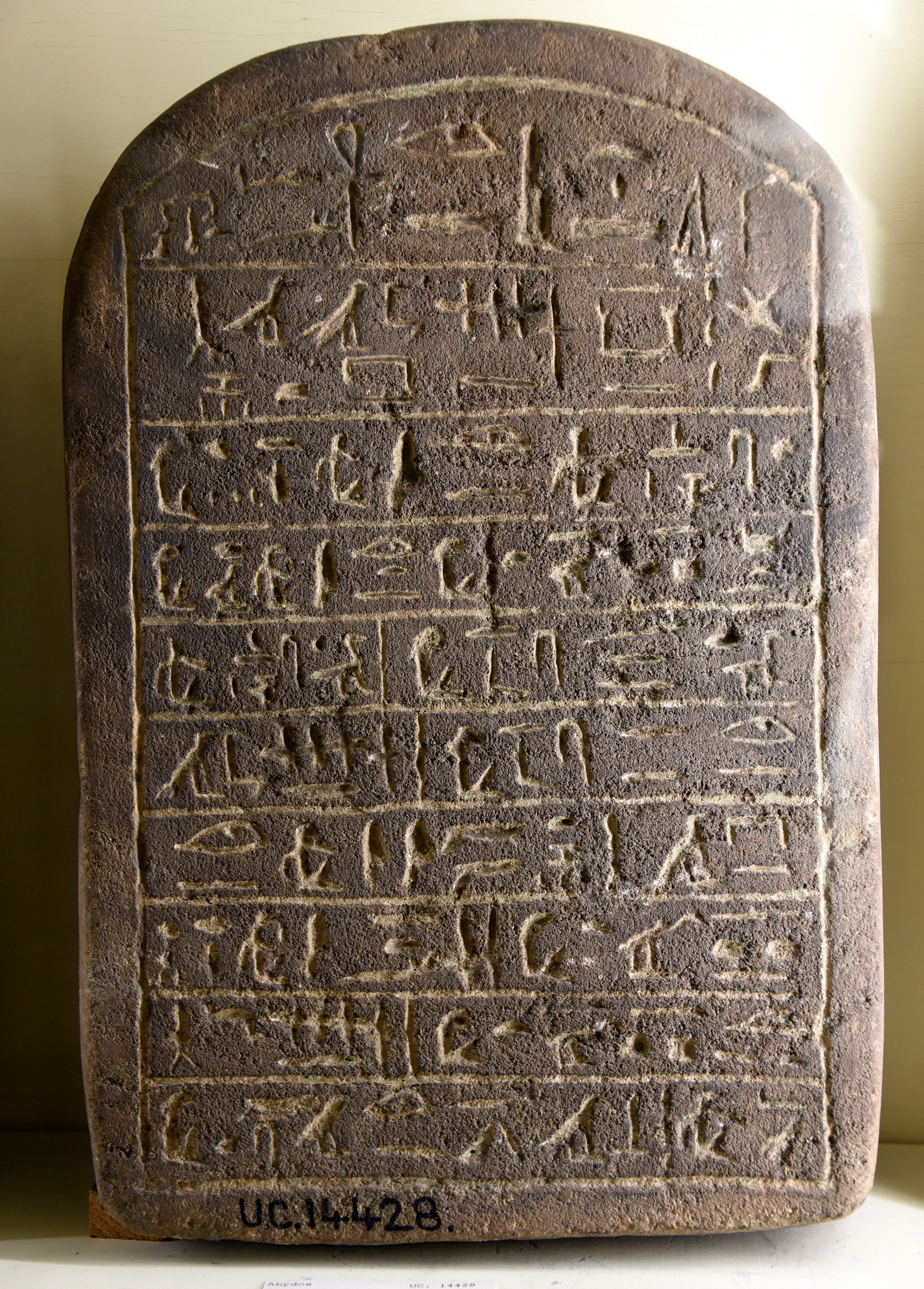 On this sandstone stela, there are 10 lines of hieroglyphs inside the border line. The stela mentions the name of the guard of the bureau of fields, Sehetepibre (born of Ite). From the Tombs of The Courtiers at Abydos, Egypt. Middle Kingdom, 12th Dynasty, 19th to 20th centuries BCE. The Petrie Museum of Egyptian Archaeology, London (With thanks to The Petrie Museum of Egyptian Archaeology, UCL).