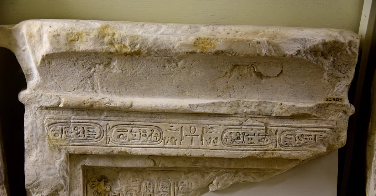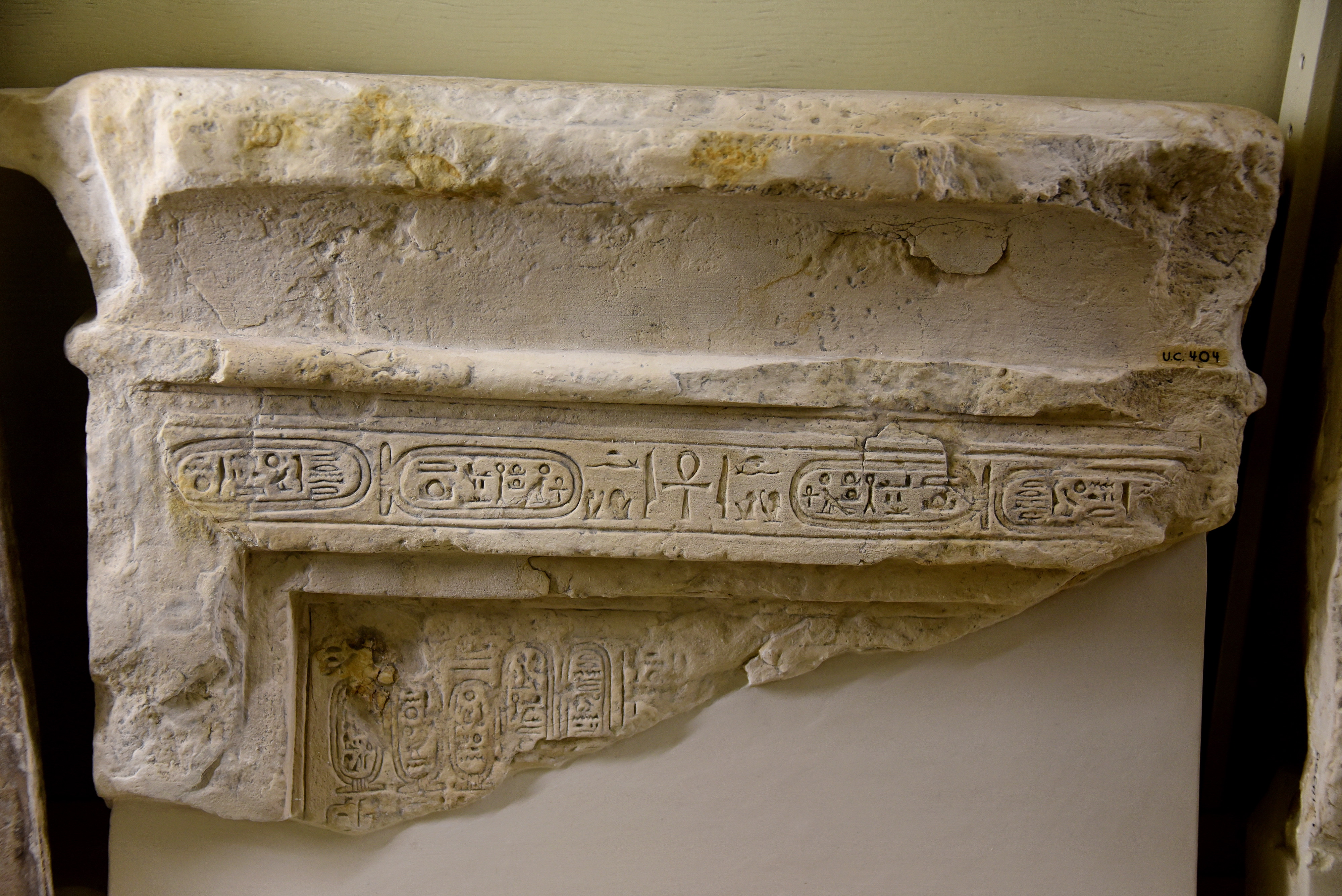 This is the upper part of a limestone stela (with a cavetto cornice). There is a 1 line of horizontal hieroglyphic inscriptions, reading symmetrically from the center of the line; early cartouches of Aten can be recognized. Below, we can see the Aten disc and cartouches of Aten, Akhenaten, and Nefertiti. From Tell Al-Amarna, Egypt. Reign of Akhenaten, circa 1353–1336 BCE. The Petrie Museum of Egyptian Archaeology, London (with thanks to The Petrie Museum of Egyptian Archaeology, UCL).