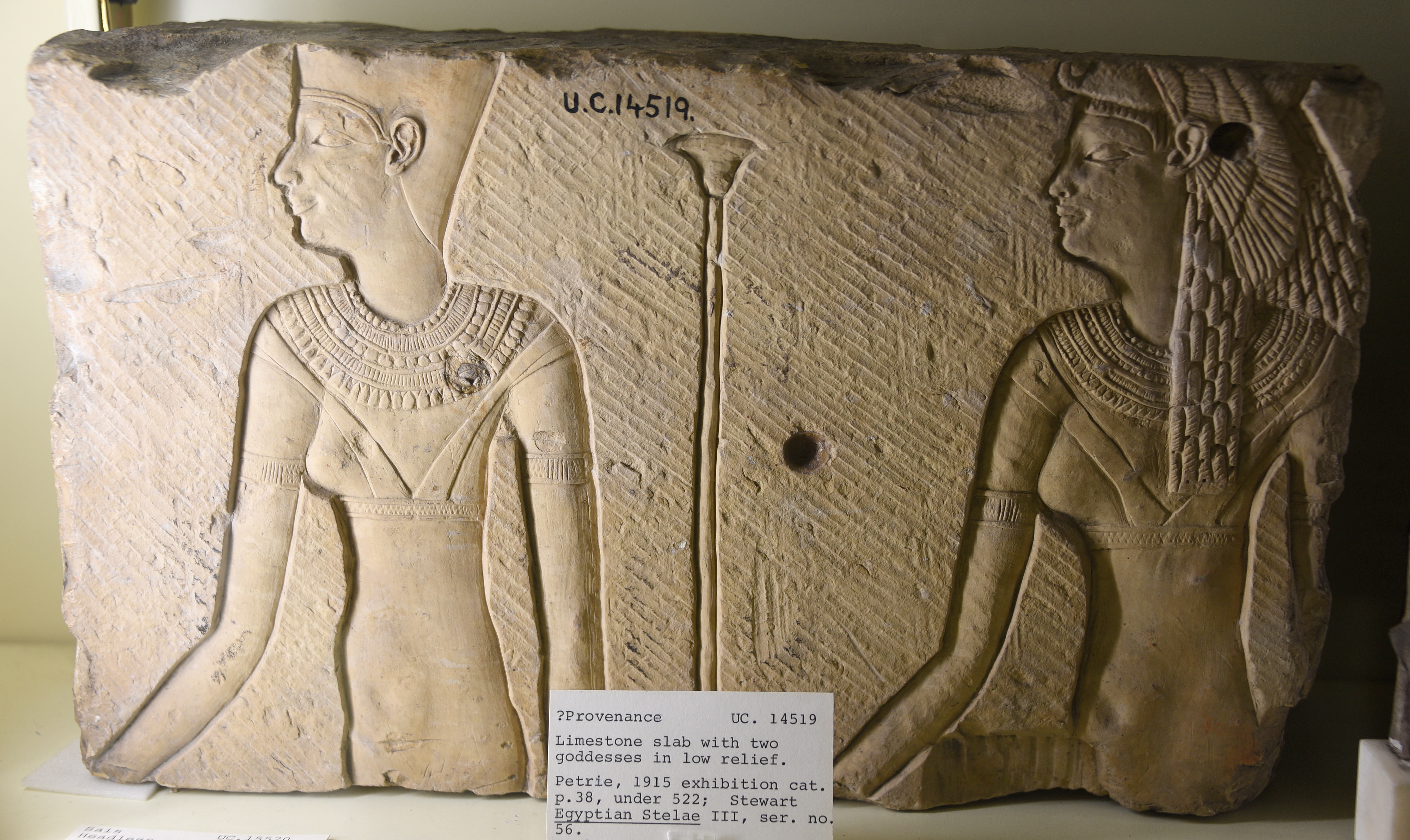 This is a limestone block which depicts the heads and bodies of two goddesses; both are looking to the left side. The background was left rough. From Egypt, precise provenance of excavation is unknown. Ptolemaic Period, 332-30 BCE. The Petrie Museum of Egyptian Archaeology, London (with thanks to The Petrie Museum of Egyptian Archaeology, UCL).