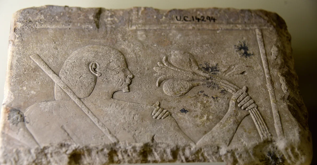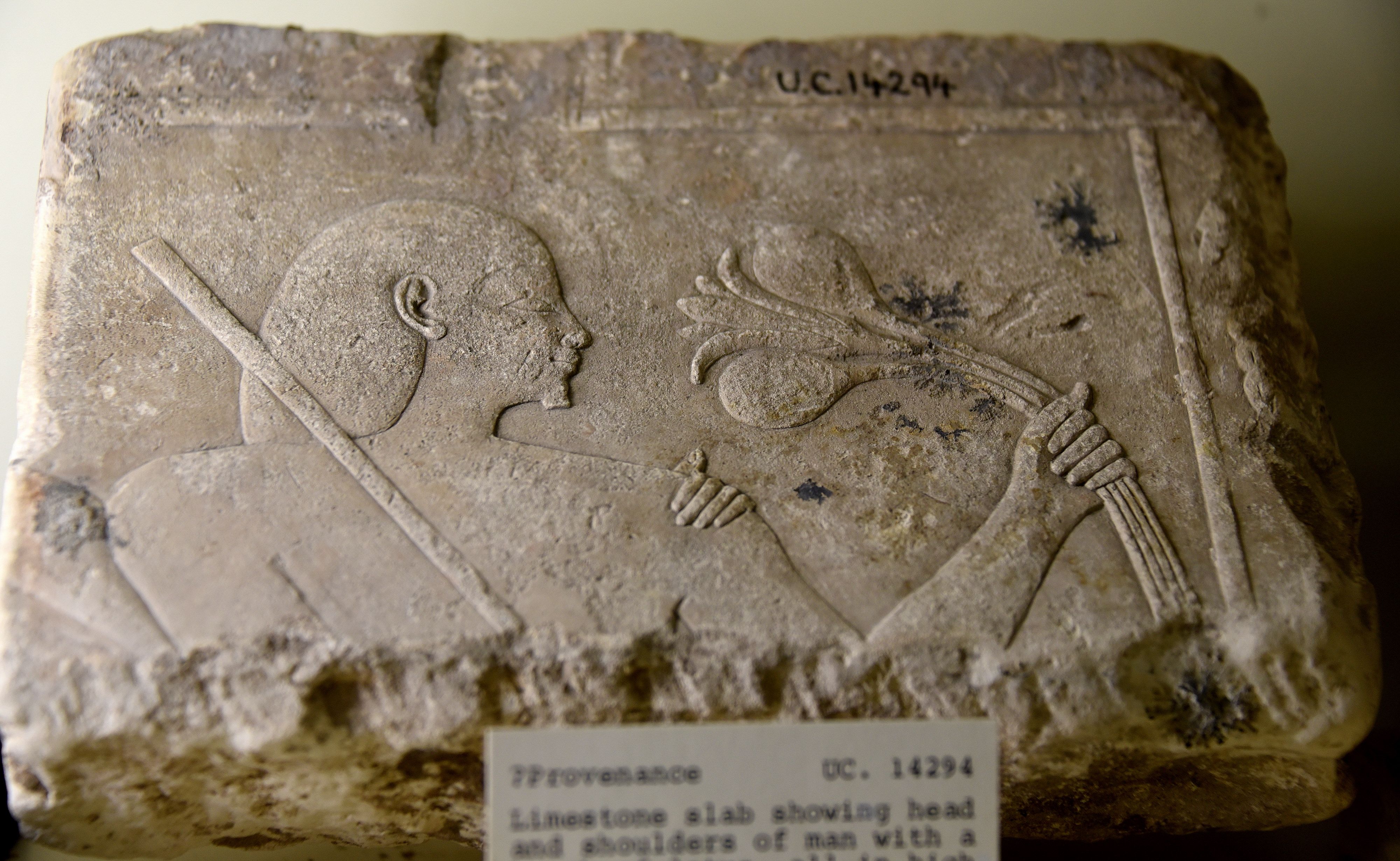 This limestone fragment depicts part of delicate raised relief. It shows the head and shoulders of a male figure. The man has a small beard, looks to the right side, and holds a bunch of lotus flowers in his left hand. The right hand holds a stick which passes over his right shoulder. A woman stands behind him and puts her hand over his left shoulder. At the right edge, we can recognize slight traces of a column of hieroglyphs with h-cord below tail (?) of a bird sign. From Lahun (Fayum Governorate), Egypt. Late Period, 672-332 BCE. The Petrie Museum of Egyptian Archaeology, London (with thanks to The Petrie Museum of Egyptian Archaeology, UCL).