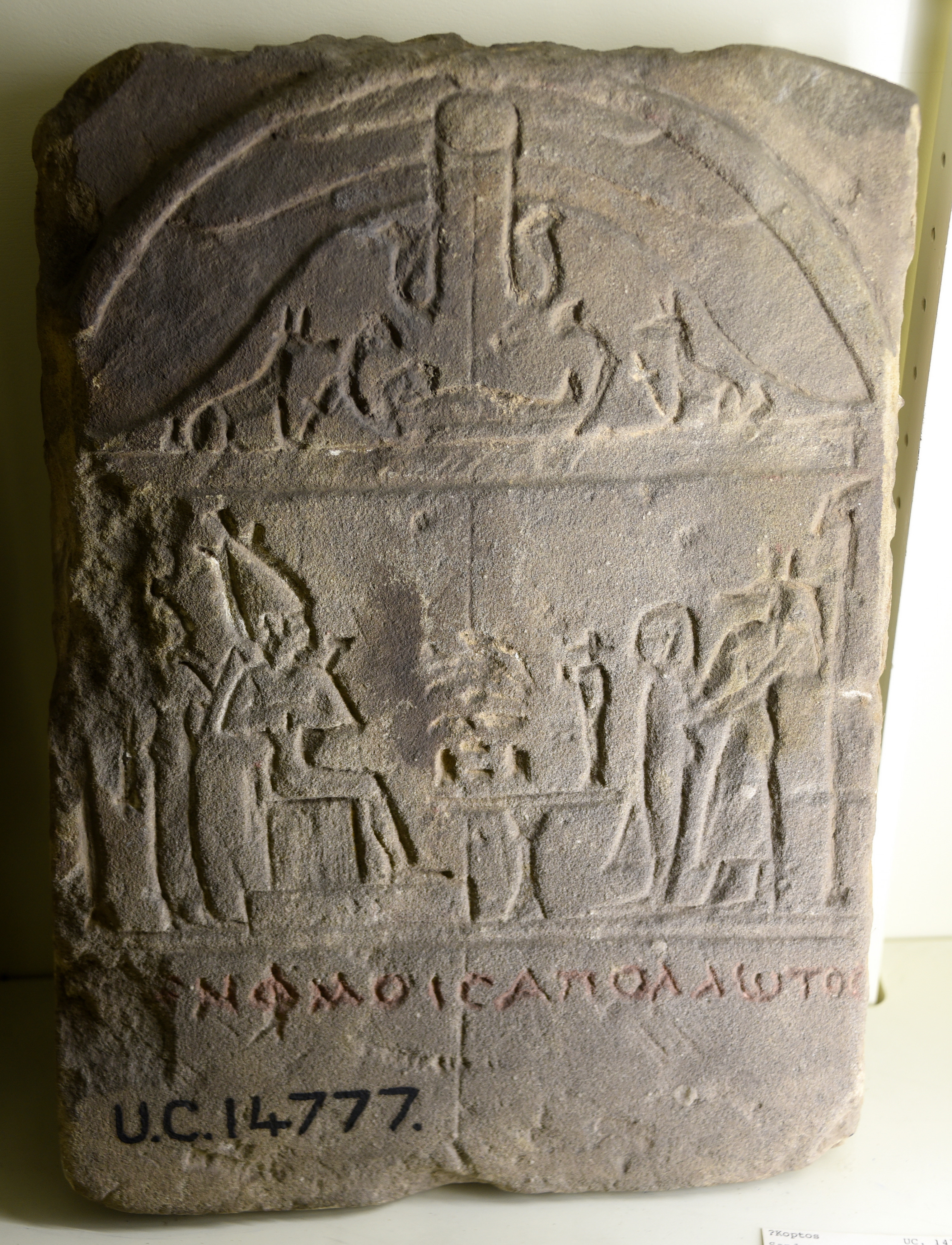 This is a sandstone stela. In the upper part, there is a winged disk with pendent uraei above a mummy in a boat; a jackal is present on either side of the boat. In the middle of the stela, there is a waz sceptre on either edge. On the left side, The god Osiris is enthroned with goddess Isis, who stands behind. In front of Osiris, there is an offering table. On the right side, the god Anubis presents a standing mummy of a deceased person. The Greek inscriptions are seen at the lower part of the stela; they read: "[Pse?]nphmois son of Apollos" (another possible restoration of the name is Senphmois). From Koptos. Roman Egypt, 30 BCE to 641 CE. The Petrie Museum of Egyptian Archaeology, London (with thanks to The Petrie Museum of Egyptian Archaeology, UCL).