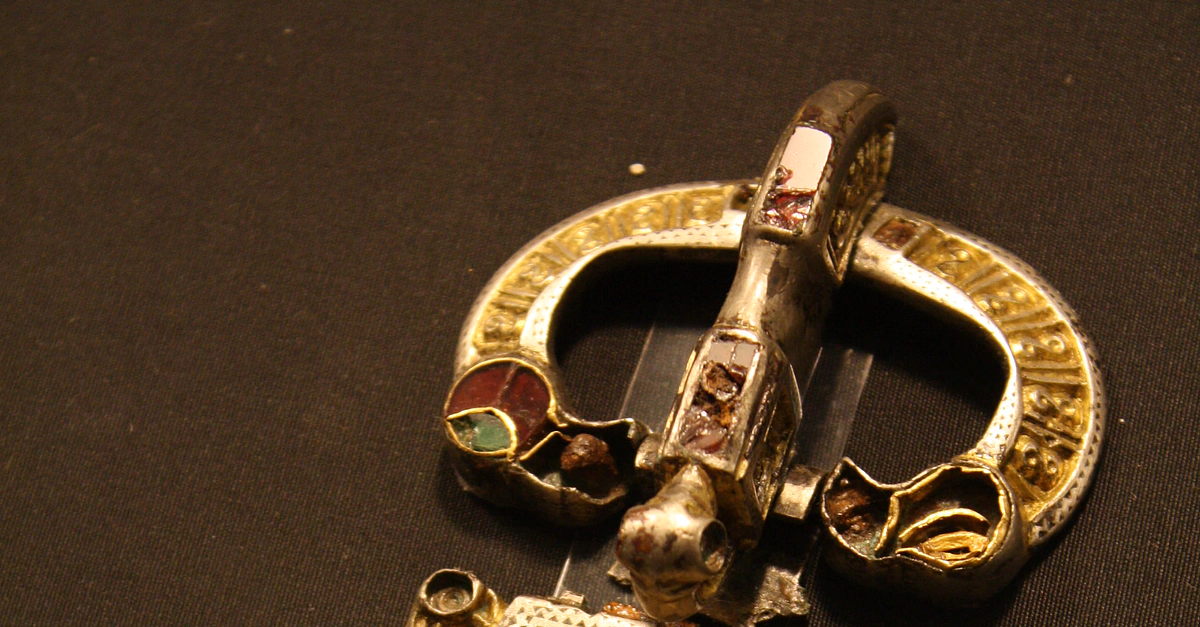 A Roman fibula (brooch or fastener) in gilded silver with semi-precious stones. 5th century CE. Provenance unknown. (Archaeological Museum, Pavia, Italy)