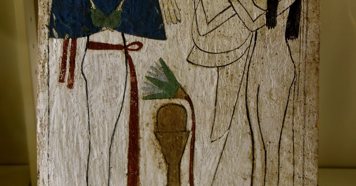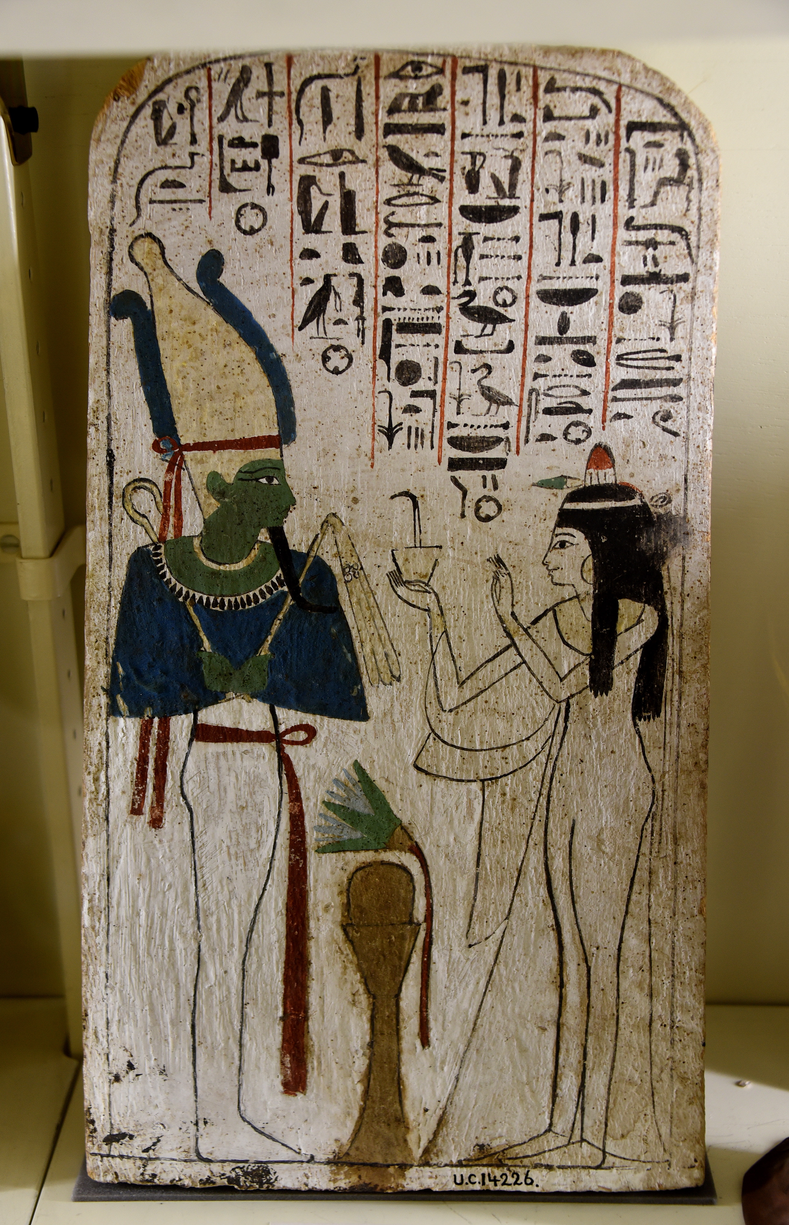 This painted wooden stela depicts a woman whose name was identified as Neskhons; she was the wife of the High Priest of Amun Pinedjem (II). On the right side, Neskhons looks to the left and makes an offerring to the god Osiris. There are seven vertical columns of hieroglyphic inscriptions above, identifying the god as Osiris with epithets and her as "the Osiris the great head of the first troupe of Amun-Ra king of the gods, the god's servant of Khnum lord of the First Cataract, king's son of Kush, overseer of the southern hill-lands, god's servant of the Lady of Offerings of Serudet, head of noblewomen Neskhons true of voice". From Thebes, Egypt. 21st Dynasty, circa 965 BCE.