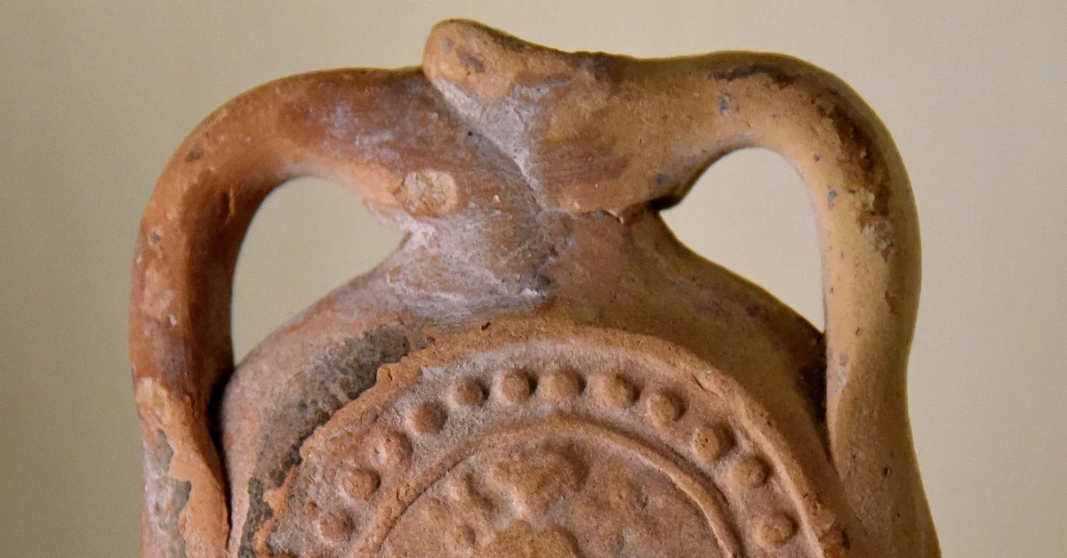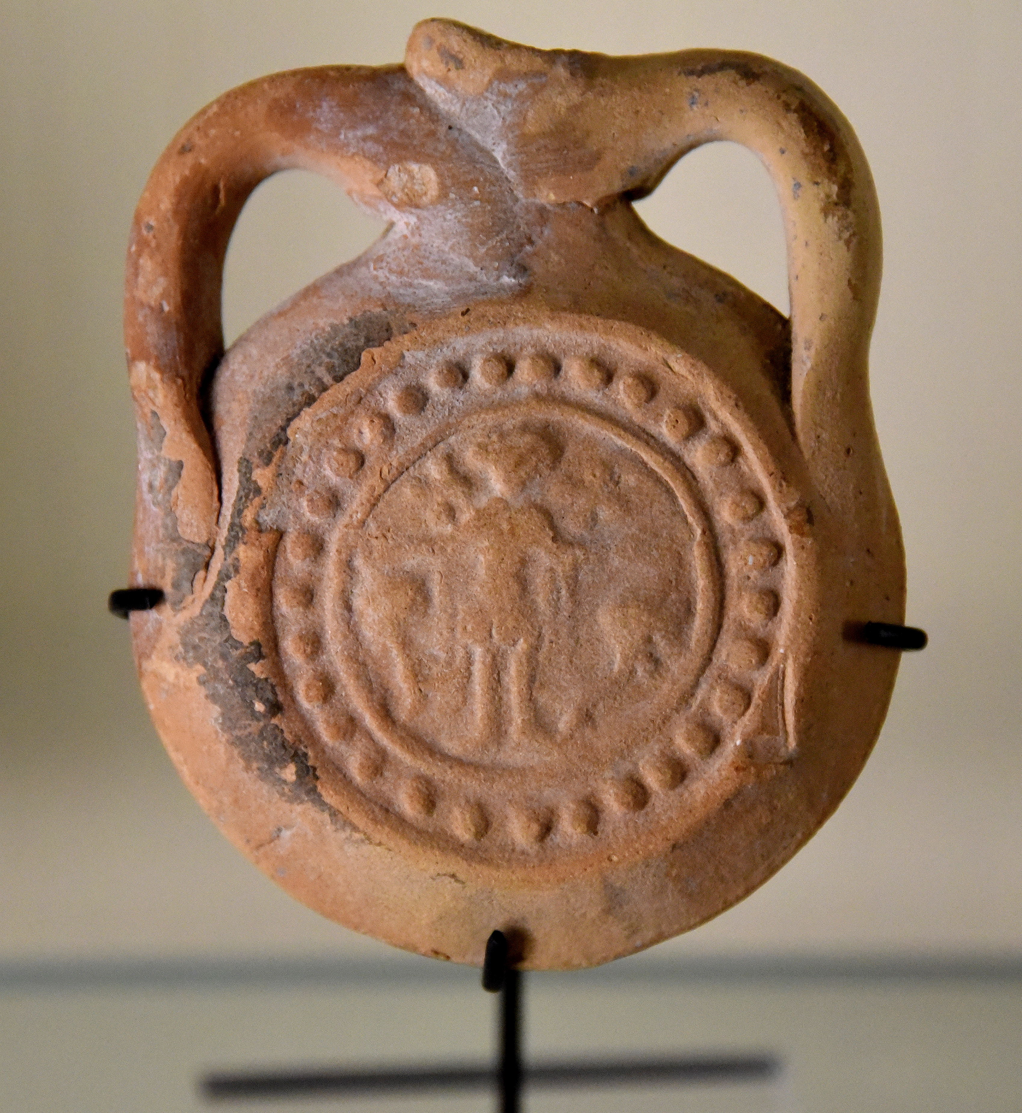 This is a pinkish pottery bottle, through which Christian pilgrims took water from the healing spring of St. Menas near Alexandria. From Alexandria, Egypt. Byzantine period, 4th to 7th centuries CE. Unpublished. The Petrie Museum of Egyptian Archaeology, London (with thanks to The Petrie Museum of Egyptian Archaeology, UCL).