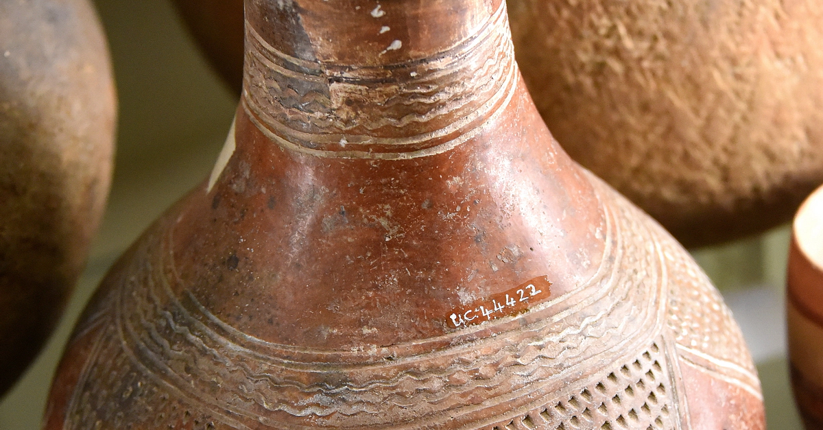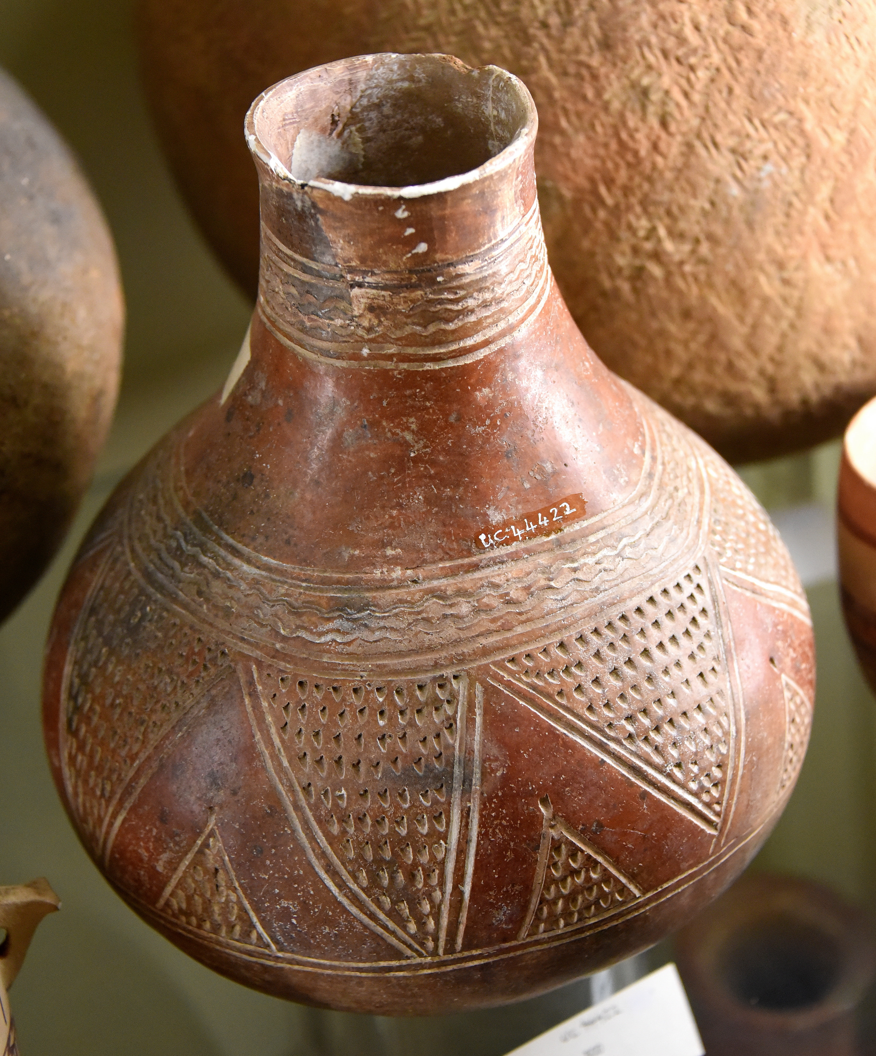 This is a red burnished globular flask with a wide mouth. The flask has been incised with decoration of horizontal bands at the neck and shoulder above an impressed design of triangles. From cemetery 300 at Meroe, Sudan. Meroitic period, 300 BCE to 400 CE. Unpublished. The Petrie Museum of Egyptian Archaeology, London (with thanks to The Petrie Museum of Egyptian Archaeology, UCL).