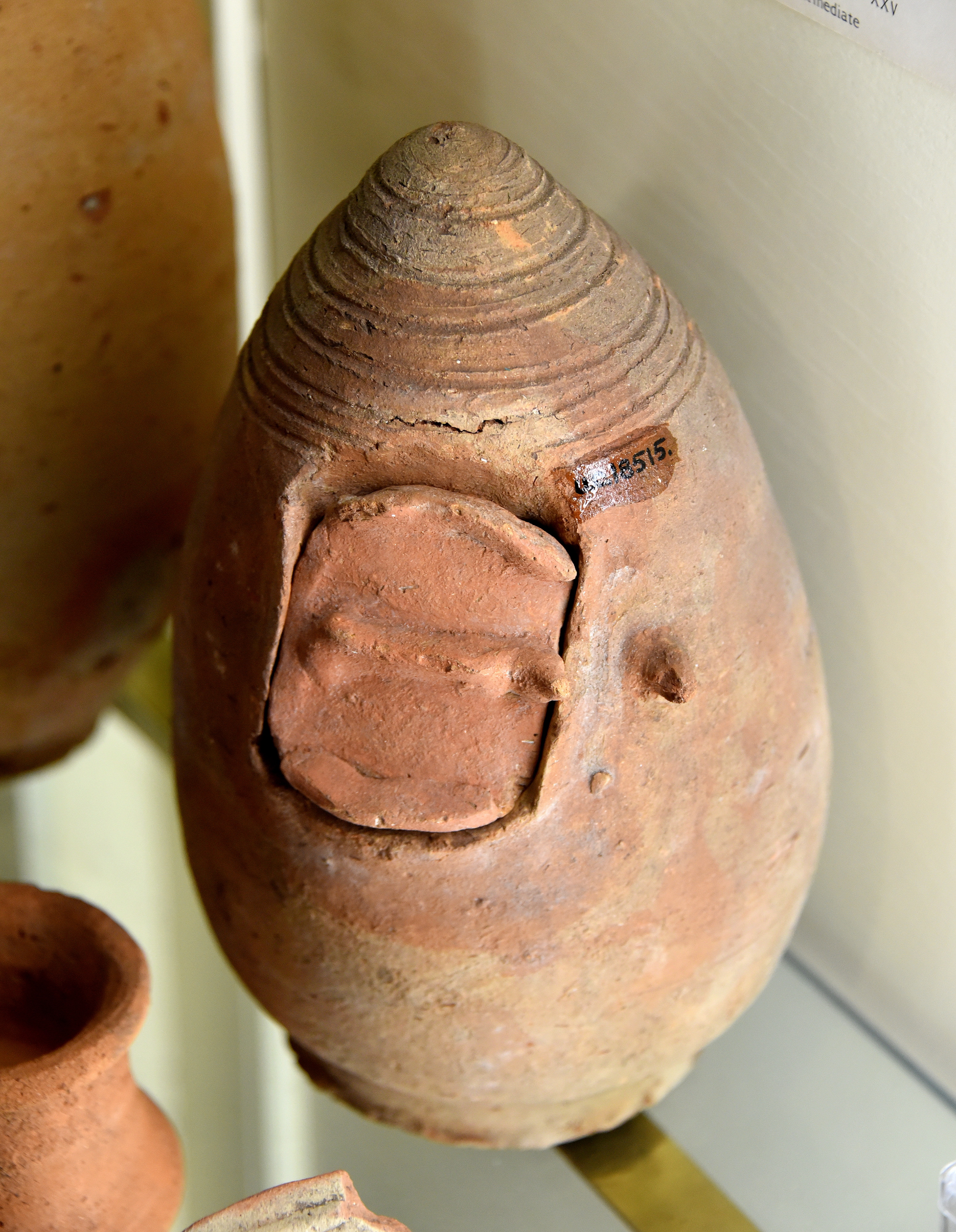 This is a redware pottery lamp which was done in the form of a granary with a separate door. It has a red slip on the door and around. From Diopolis Parva, Egypt. 2nd Intermediate Period, 1650-1550 BCE. The Petrie Museum of Egyptian Archaeology, London (with thanks to The Petrie Museum of Egyptian Archaeology, UCL).
