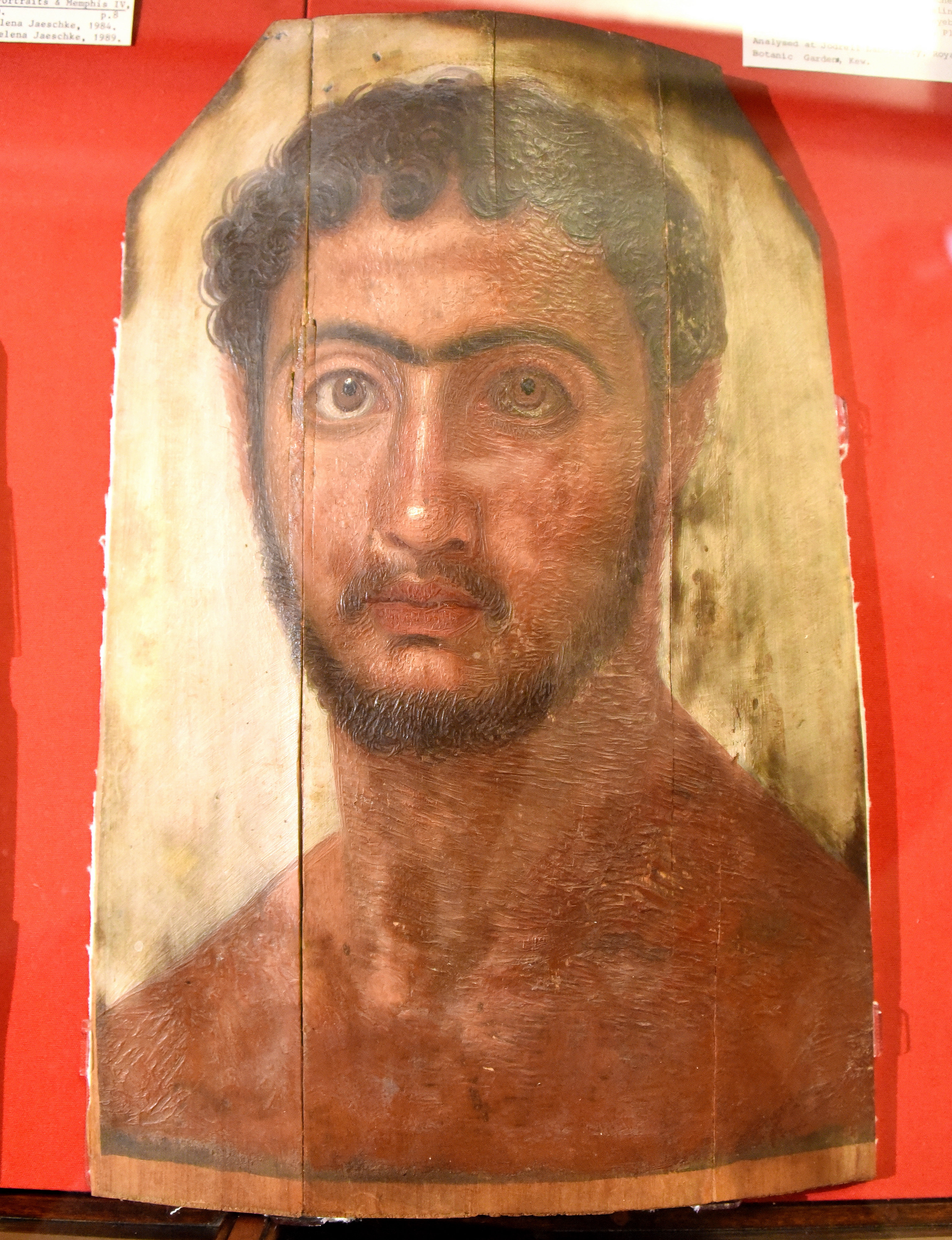 The Petrie Museum has the largest collection of these "portraits" outside of Egypt. Originally, these portraits were placed over the mummified body; these images were hailed as the first lifelike representations of real people on their first exhibition in London in 1888. The portraits were excavated in 1888-1889 and 1901-1911. This man has a curly light beard and a mustache. It appears that a sharp tool was used to delineate the shape of the face, ears, and eyebrows.