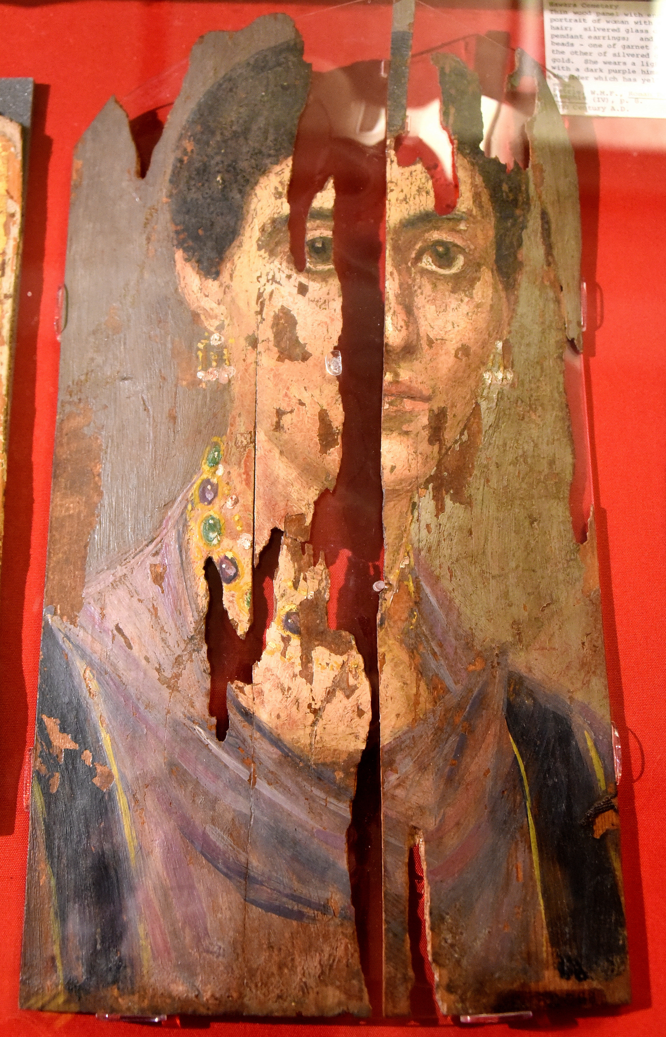The Petrie Museum has the largest collection of these "portraits" outside of Egypt. Originally, these portraits were placed over the mummified body; these images were hailed as the first lifelike representations of real people on their first exhibition in London in 1888. The portraits were excavated in 1888-1889 and 1910-1911. This woman has short black curly hair and wears silvered glass/coral and gold pendant earrings. She wears 2 strings of beads; one garnet and beryl with gold and one with silvered glass/coral and gold. She wears a light purple chiton with a dark purple himation over each shoulder, which has a yellow band on each of them.