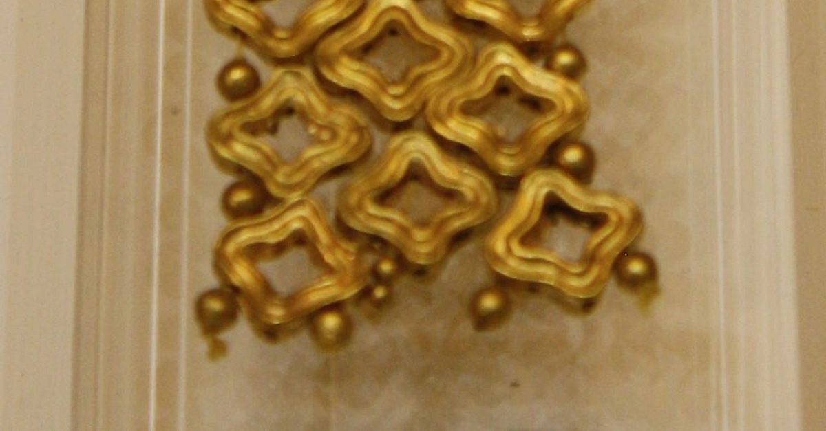 A string of gold beads (1500-1350 BCE) from Mycenae. Nafplio Archaeological Museum.