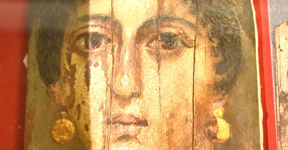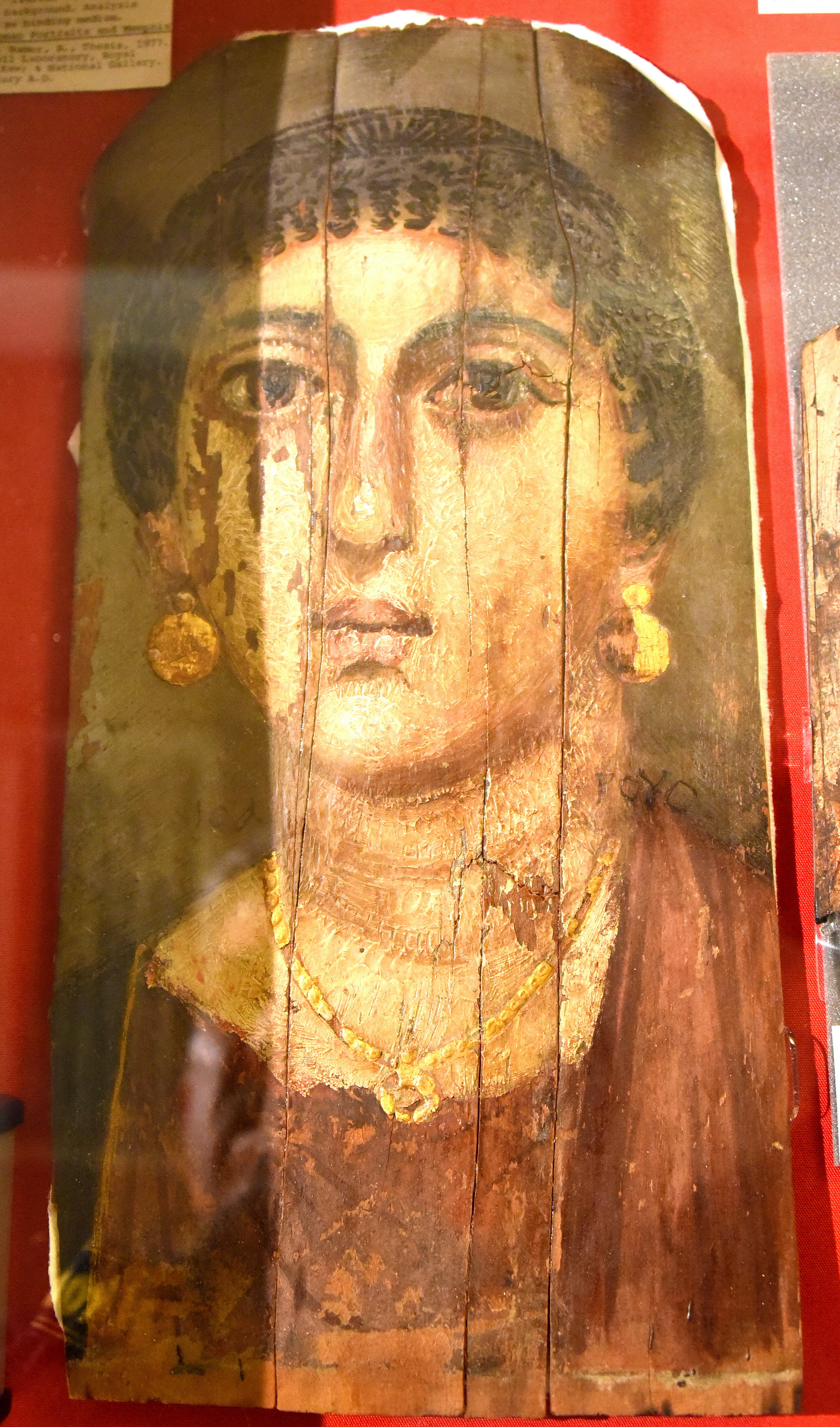The Petrie Museum has the largest collection of these "portraits" outside of Egypt. Originally, these portraits were placed over the mummified body; these images were hailed as the first lifelike representations of real people on their first exhibition in London in 1888 CE. The portraits were excavated in 1888-1889 and 1910-1911. This woman wears a brown robe, gold earrings, and simple necklace. "Isarous" is written in Greek across the background. An analysis of the plate revealed the presence of beeswax as the binding medium.