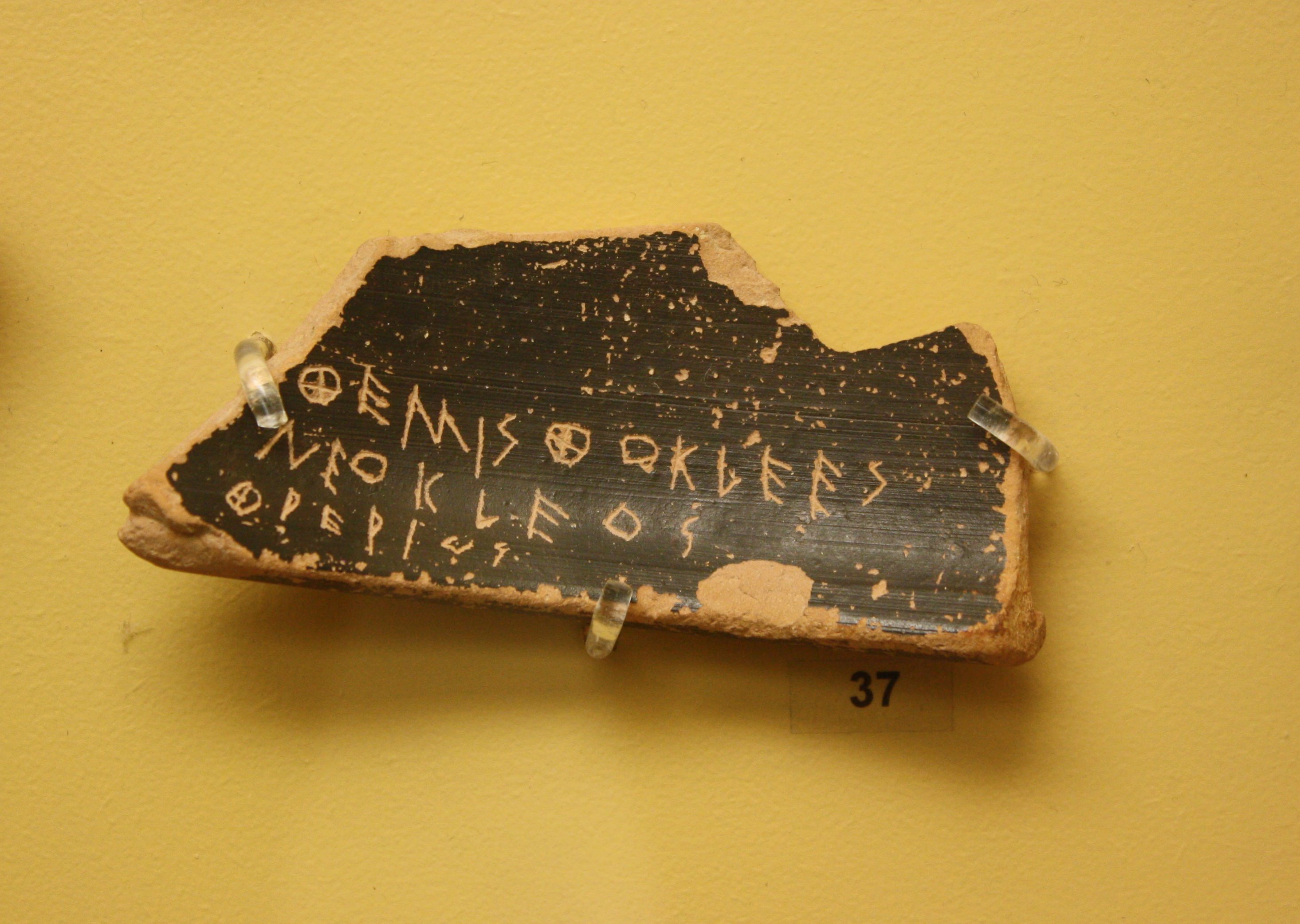 Pottery ostrakon identifying Themistocles, 480-460 BCE. These were used in Athens to vote a particular citizen to be exiled from the polis. (Museum of the Ancient Agora, Athens)