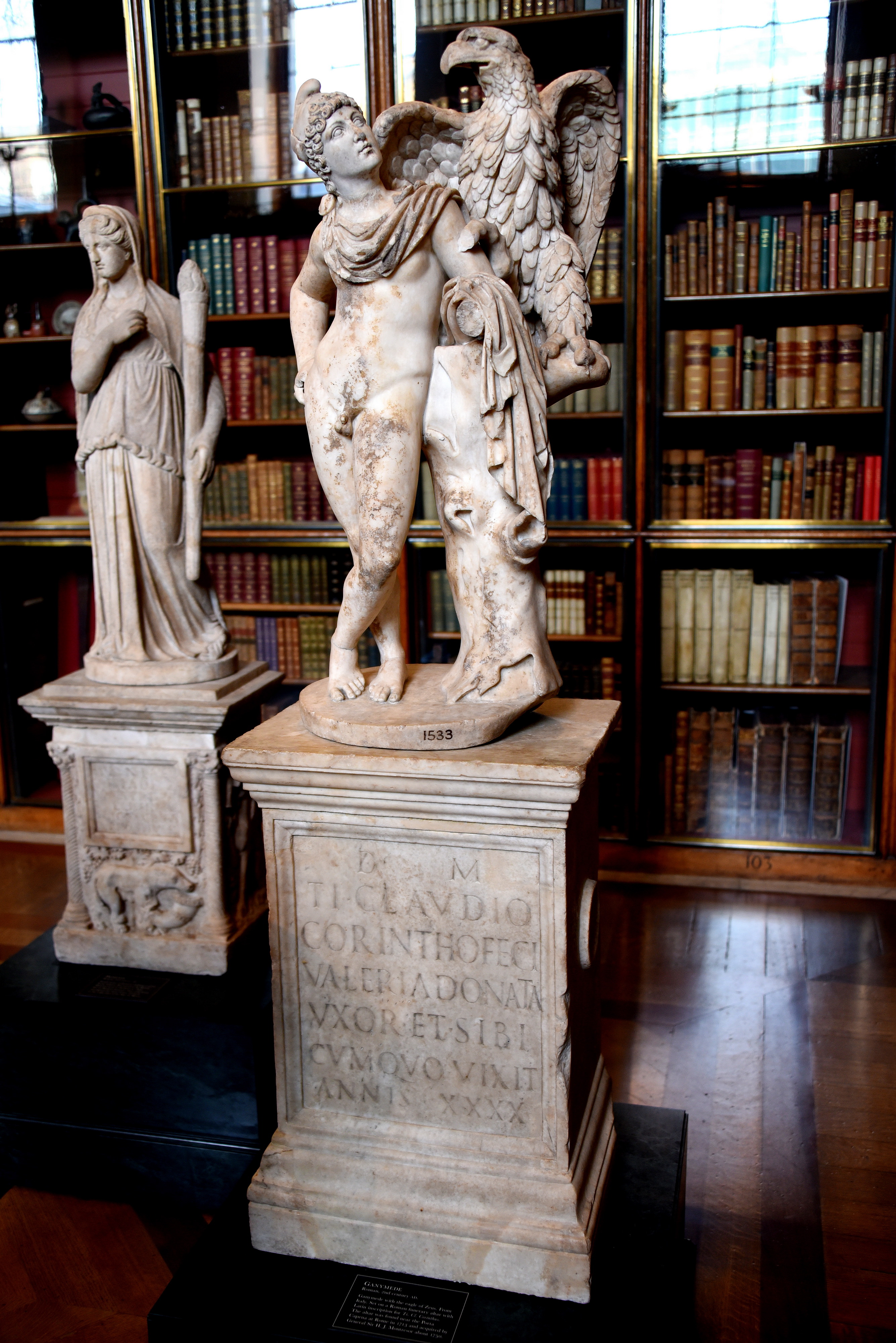 This statue came from Italy. Set on a Roman funerary altar with Latin inscription for "Ti Cl Corinthus." The altar was found near Porta Capena at Rome in 1713 CE and acquired by General Sir H. J. Montresor, circa 1750 CE. Roman, 2nd century CE. The British Museum, London.