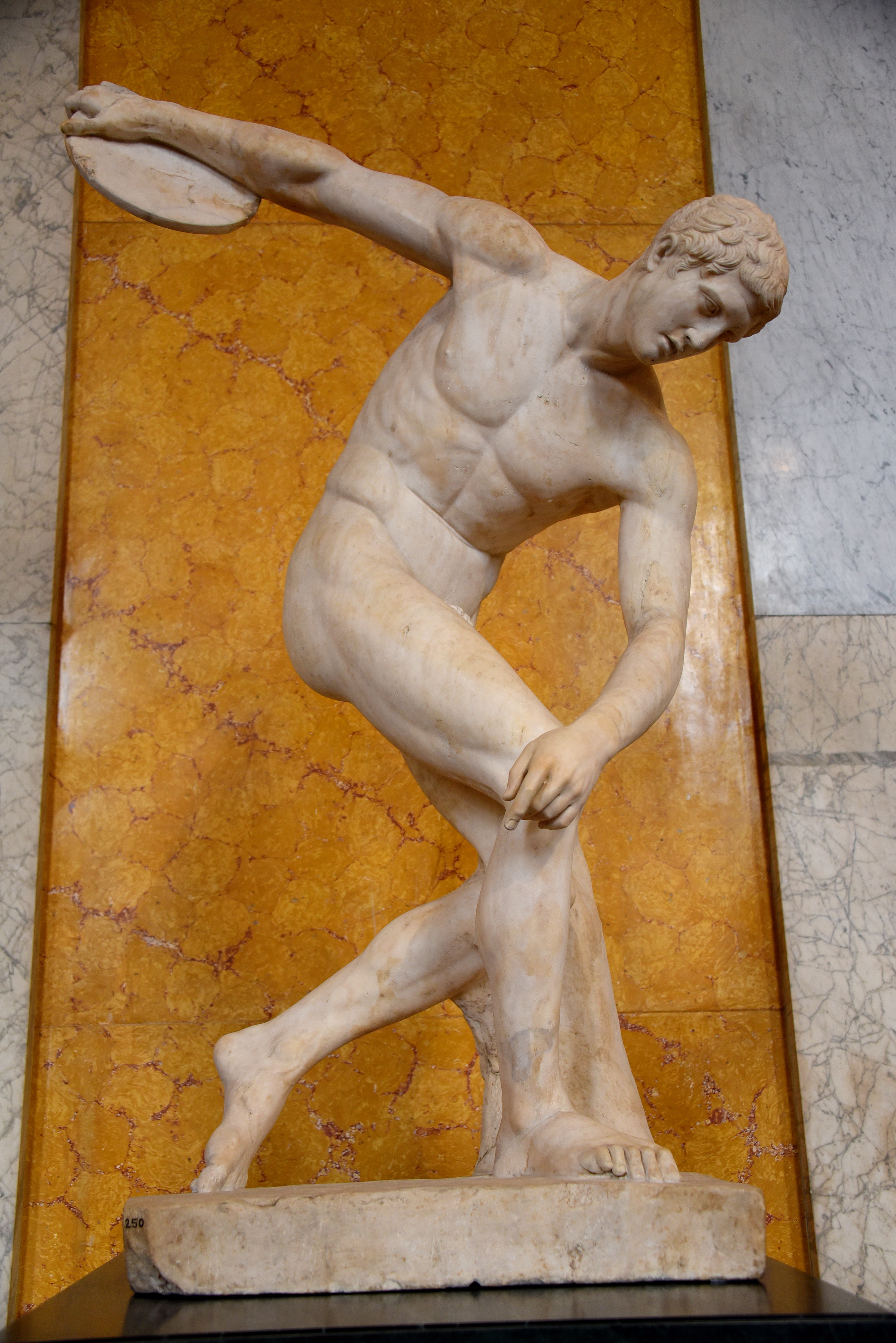 Discovered in 1791 CE in the Villa of the Roman Emperor Hadrian (117-138 CE)at Tivoli outside Roma. The head, although ancient and found with the statue, it is not the original. Formerly in the Collection of Charles Townley in London. Roman, 2nd century CE; after a Greek original by the sculptor Myron of 450-440 BCE. The British Museum, London.