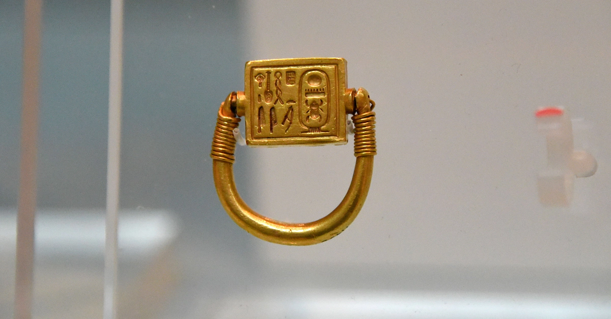 Gold ring with the name of Thutmose III and epithets: "Menkhperra beloved of Ptah beautiful-of-face'. The verso has the Two Ladies name of the king: "Great of Terror in All Lands". The ring was found inside the tomb of Djehuty. From Saqqara, Egypt. 18th Dynasty, 1543–1292 BCE. (The British Museum, London)