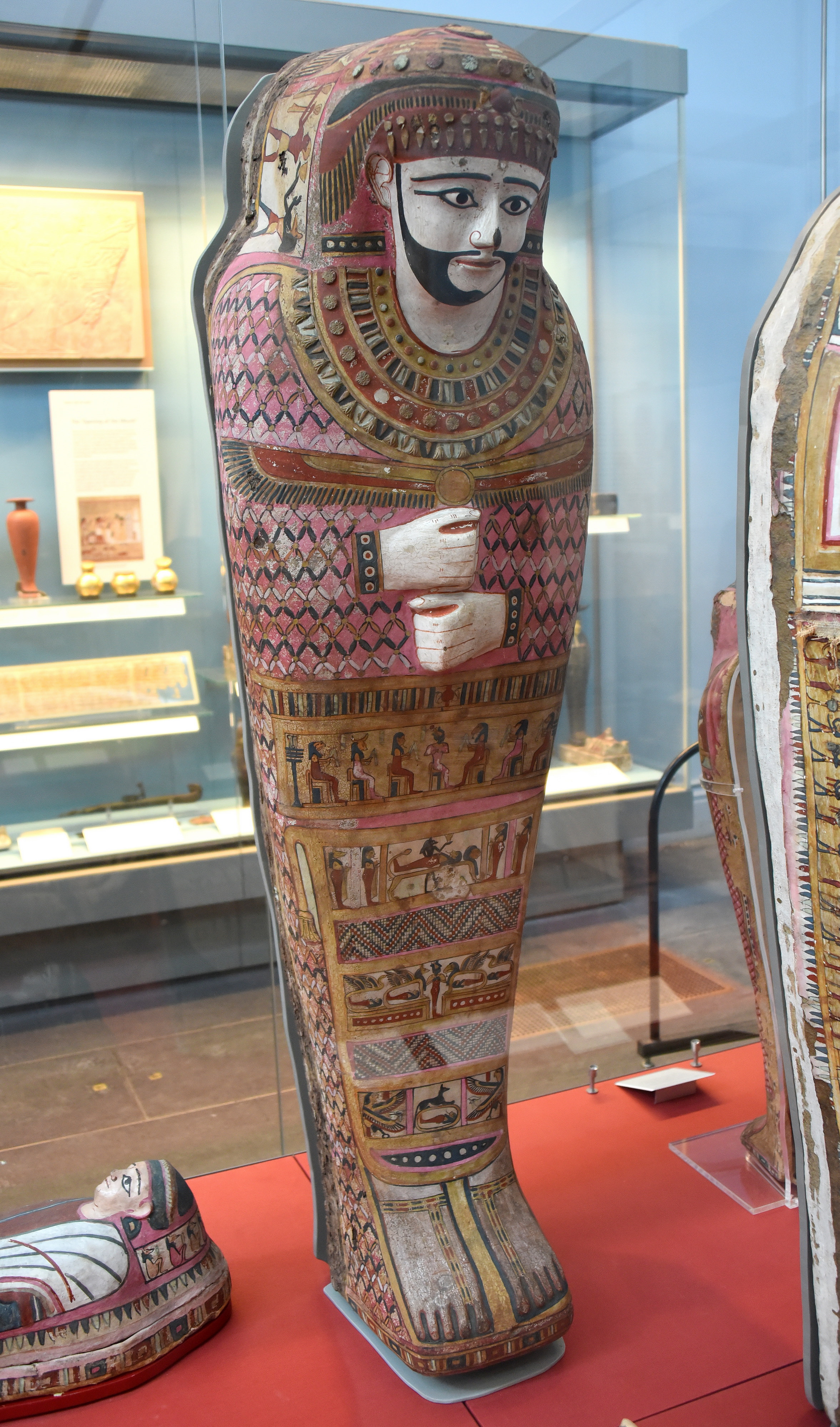 This case is made from mud mixed with straw or chaff, with an outer skin of textile and an inner coating of plaster. The decoration is traditional Egyptian style, the surface is painted to represent a bead-net incorporating a collar, with a winged sun-disc and cartonnage or textile plaques decorated with figures of gods. The feet are represented wearing sandals. Unusually, a naturalistic beard and moustache are painted on the face. The eyes are inlaid with glass. From Akhmim, Egypt. Graeco-Roman, 1st century BCE to 1st century CE. (The British Museum, London)