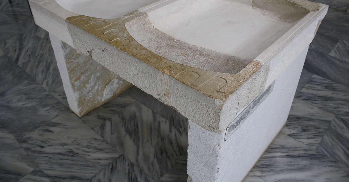 Restored stone table on which were placed the sacrificial offerings to the Gods in Greek religious practice. One tray was for the 'Epidaurian Gods' (Apollo & Esklepios), the other for Zeus. (c. 300 BCE). Nemea Archaeological Museum.