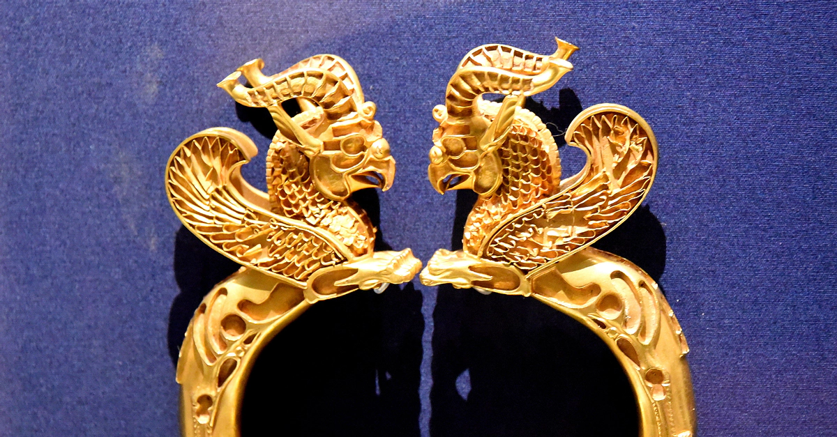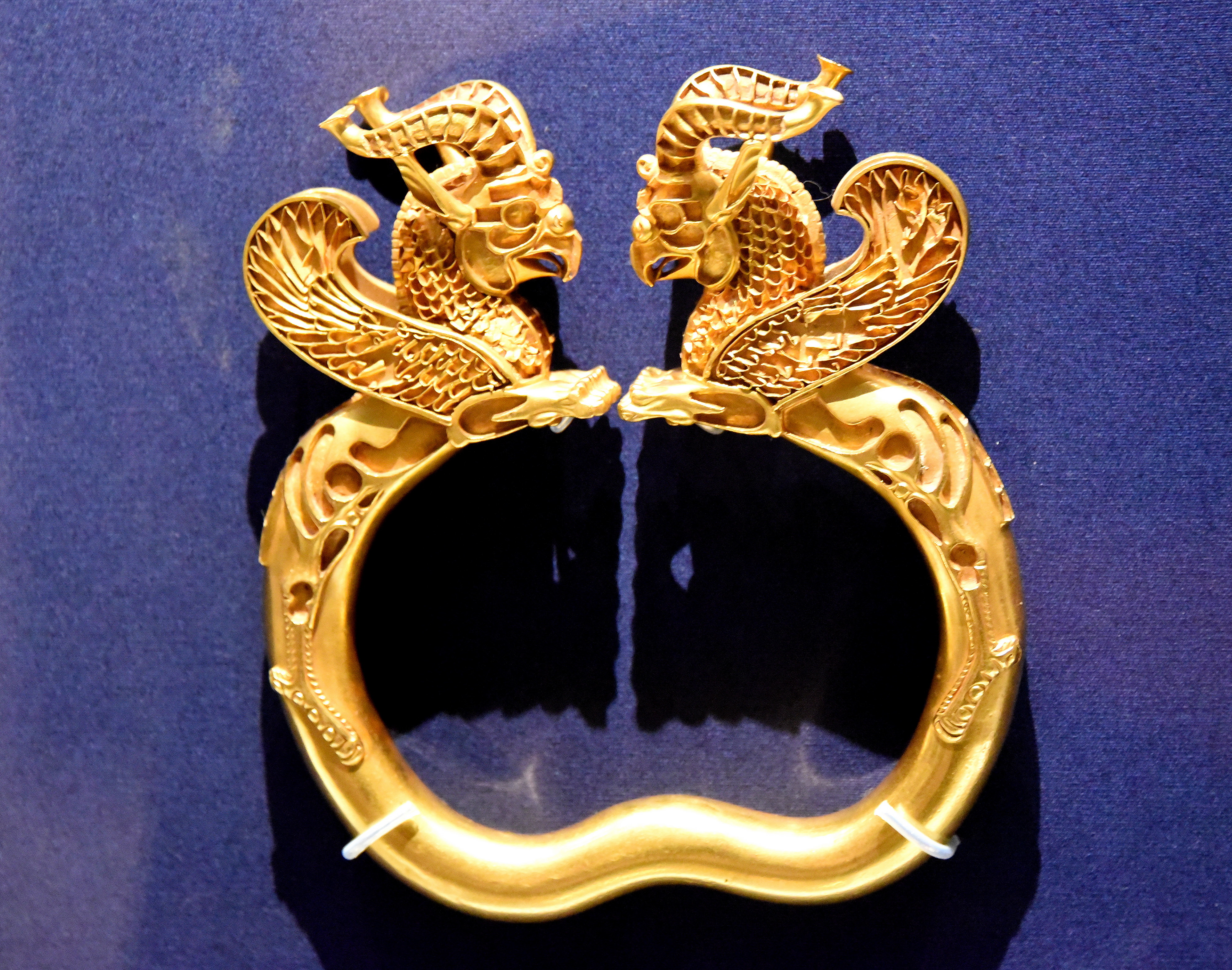 This is one of a pair of golden armlets. These objects are among the most important surviving items from ancient Persian craftsmanship. It is likely that they were intended for display rather than being worn. The lion-griffin terminals were originally inlaid with precious stones, which were later removed. This inlay is typical of high-quality jewellery from this period. Part of the Oxus treasure, from Takht-i Kuwad, Tajikistan. Achaemenid Period, 5th to 4th centuries BCE. (The British Museum, London)