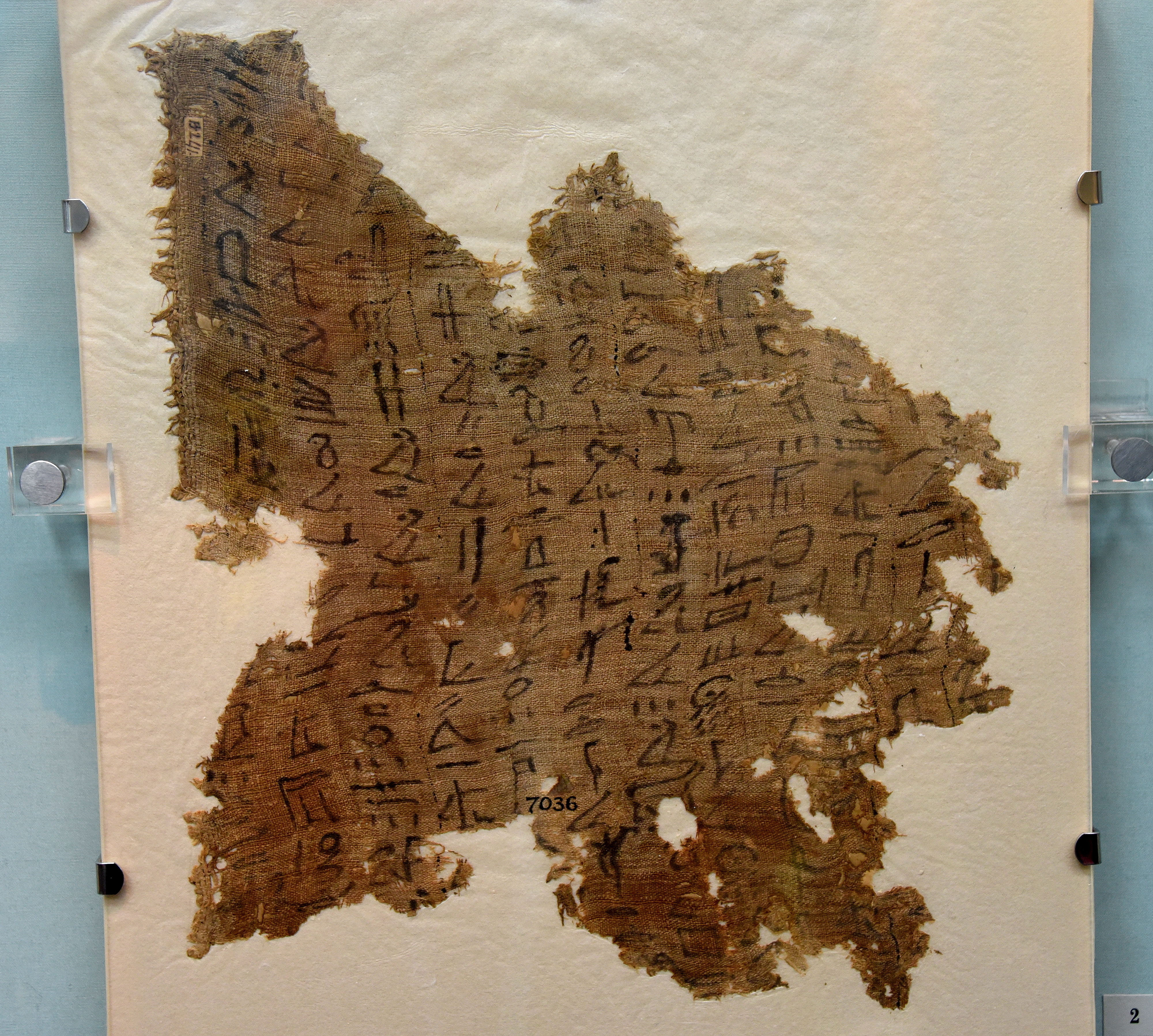 Fragment of a linen mummy shroud with texts from the Book of the Dead, written in ink. From Thebes, Egypt. 18th Dynasty, circa 1500 BCE.