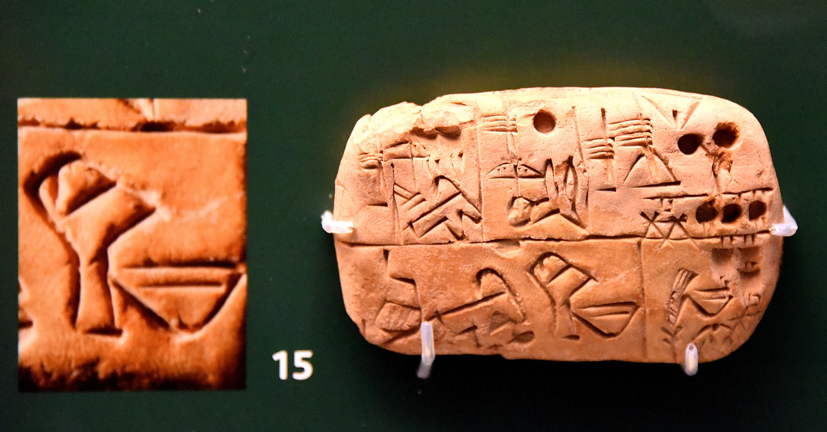 In this food issue list, "rations" is written by combining a human head a bowl (a triangular object in front of the head). This combination, in later Sumerian texts, means "to eat". The triangular object was the regular representation of bread. Three different types of numerical symbols were used. From Mesopotamia, Iraq. Late Uruk Period, 3100-3000 BCE. (The British Museum, London)