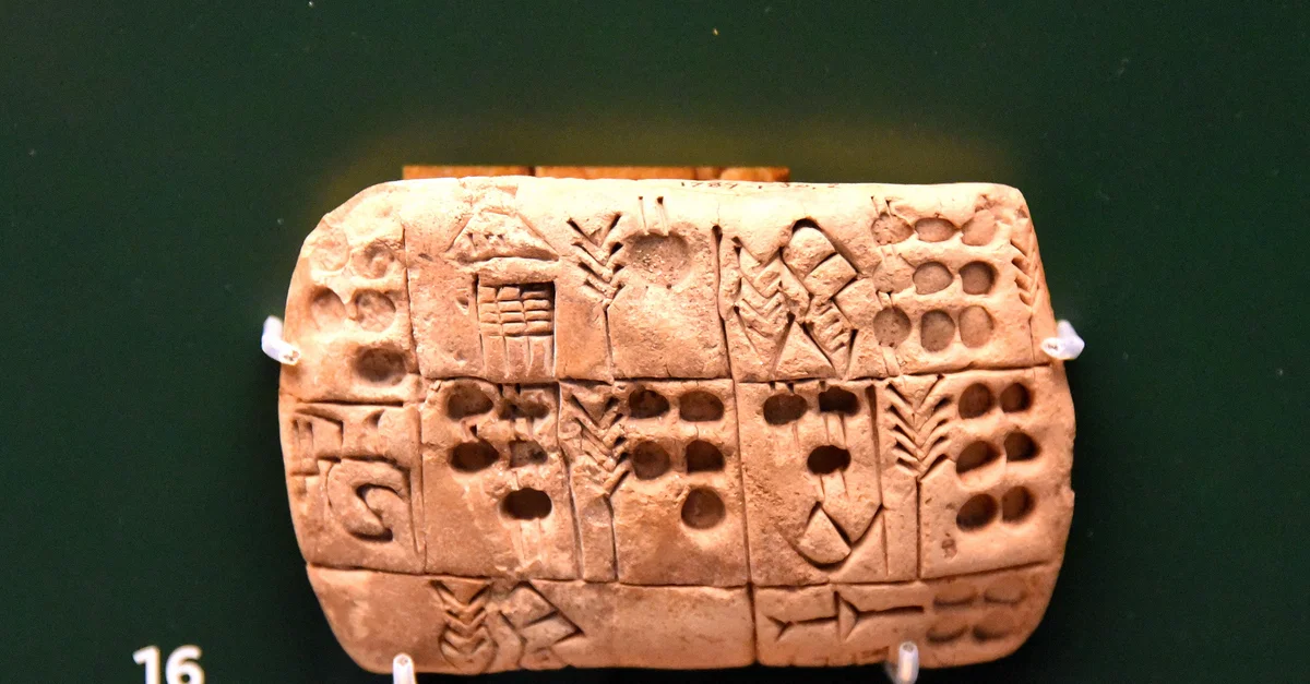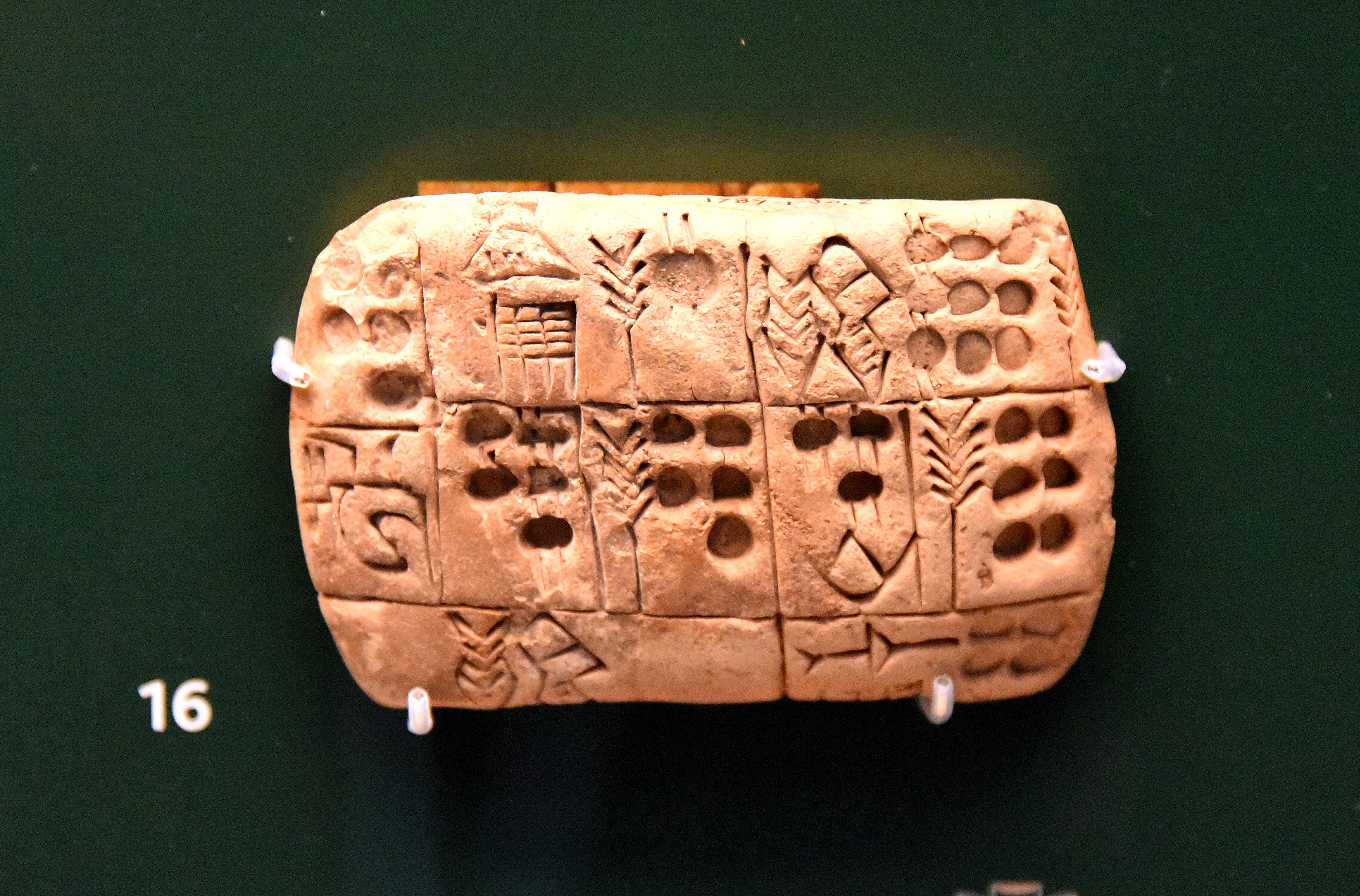 On this clay tablet, barley appears 4 times, depicted as a single stalk with ears at the top. Emmer wheat is different from barley, by writing numbers with extra strokes. Three different types of numerical symbol were used. From Mesopotamia, Iraq. Late Uruk Period, 3300-3100 BCE. (The British Museum, London)