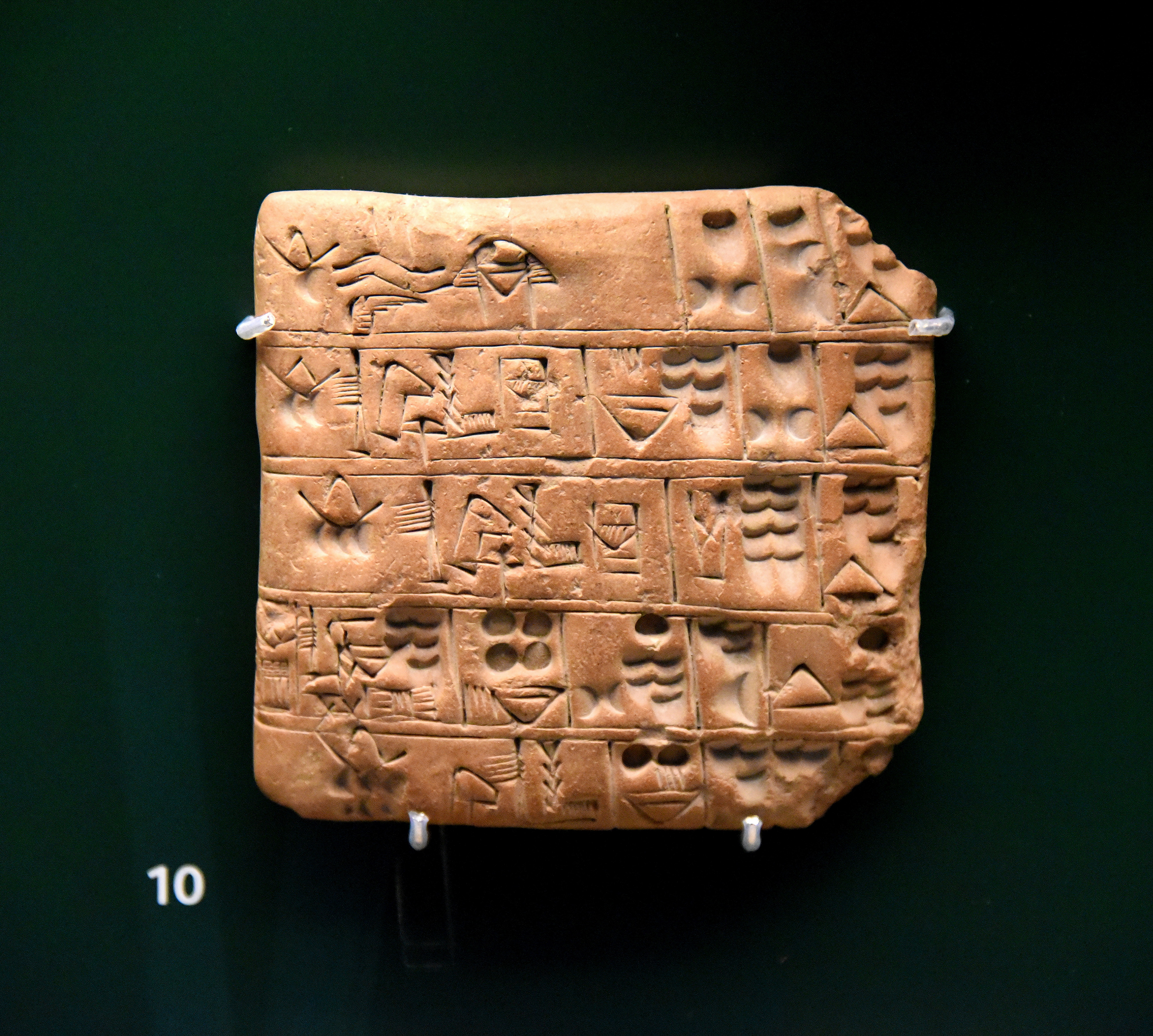 On this clay tablet, the lines are read from left to right and the day numbers appear at the left side (days 1-5). Several different types of rations were issued, possibly bread. Each line mentions the name of the recipient or the destination of issue. Probably from Jemdet Nasr, Southern Mesopotamia, Iraq. Jemdet Nasr Period, 3000-2900 BCE. (The British Museum, London)
