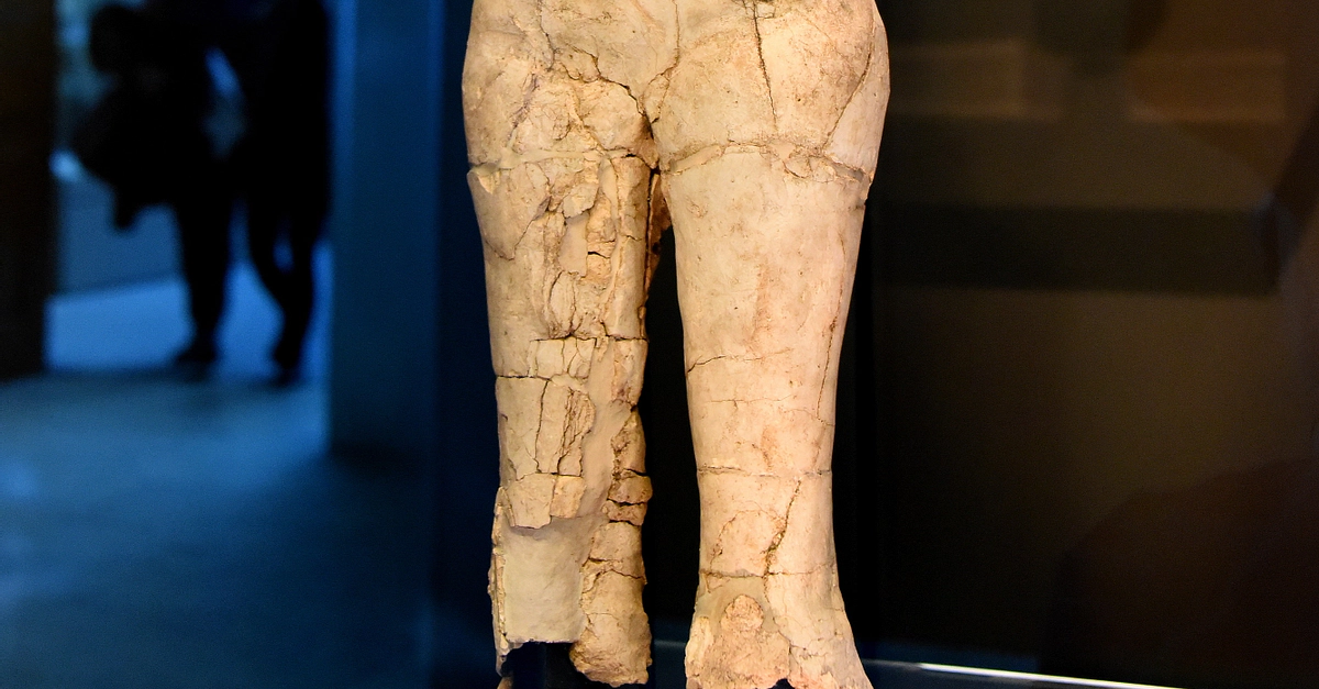This extraordinary statue is one of the earliest large-scale representations of the human form. It was found as part of a cache of up to 25 statues buried in a pit under the floor of an abandoned house. All of these statues have naturallistically rendered heads and faces. Some figures are large and and have realistically represented bodies while the smaller ones are more schematized. Many are decorated with paint or shallow incisions to indicate hair, items of clothing, and to highlight facial features. From Ain Al-Ghazal, modern-day Jordan. Pre-Pottery Neolithic B Period, 7200 BCE. Lime plaster over armatures of reeds and twine. Lent by the Department of Antiquities of Jordan. It is currently housed in the British museum, London.