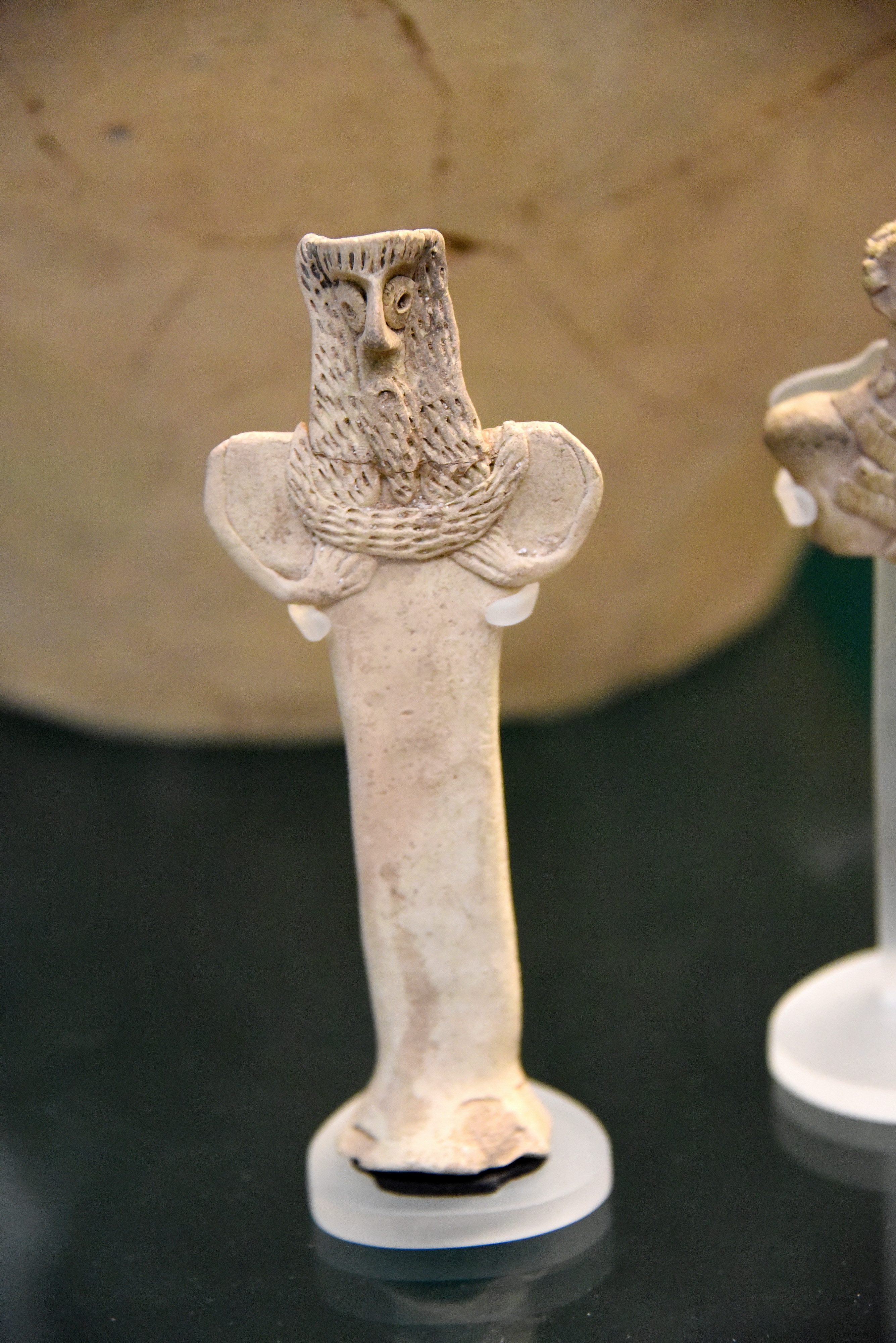 During the late 3rd millennium BCE, the area of the middle Euphrates developed a distinctive regional culture. Between 1963-1973 CE, an international rescue mission excavated a large number of sites in this region which were threatened by flooding as a result of the construction of the Tabqa dam. One such site was Tell es-Sweyhat. Excavations by T. A. Hollad on behalf of the British School of Archaeology in Jerusalem revealed extensive early and middle bronze age occupation. Figurines with pillar bases, elaborate hairstyle and applied eyes and "scarves" are characteristic of the Tabqa-Euphraets area. From Tabqa, Ar-Raqqah, modern-day northern Syria. Early Bronze Age, 2400-2000 BCE. (The British Museum, London)