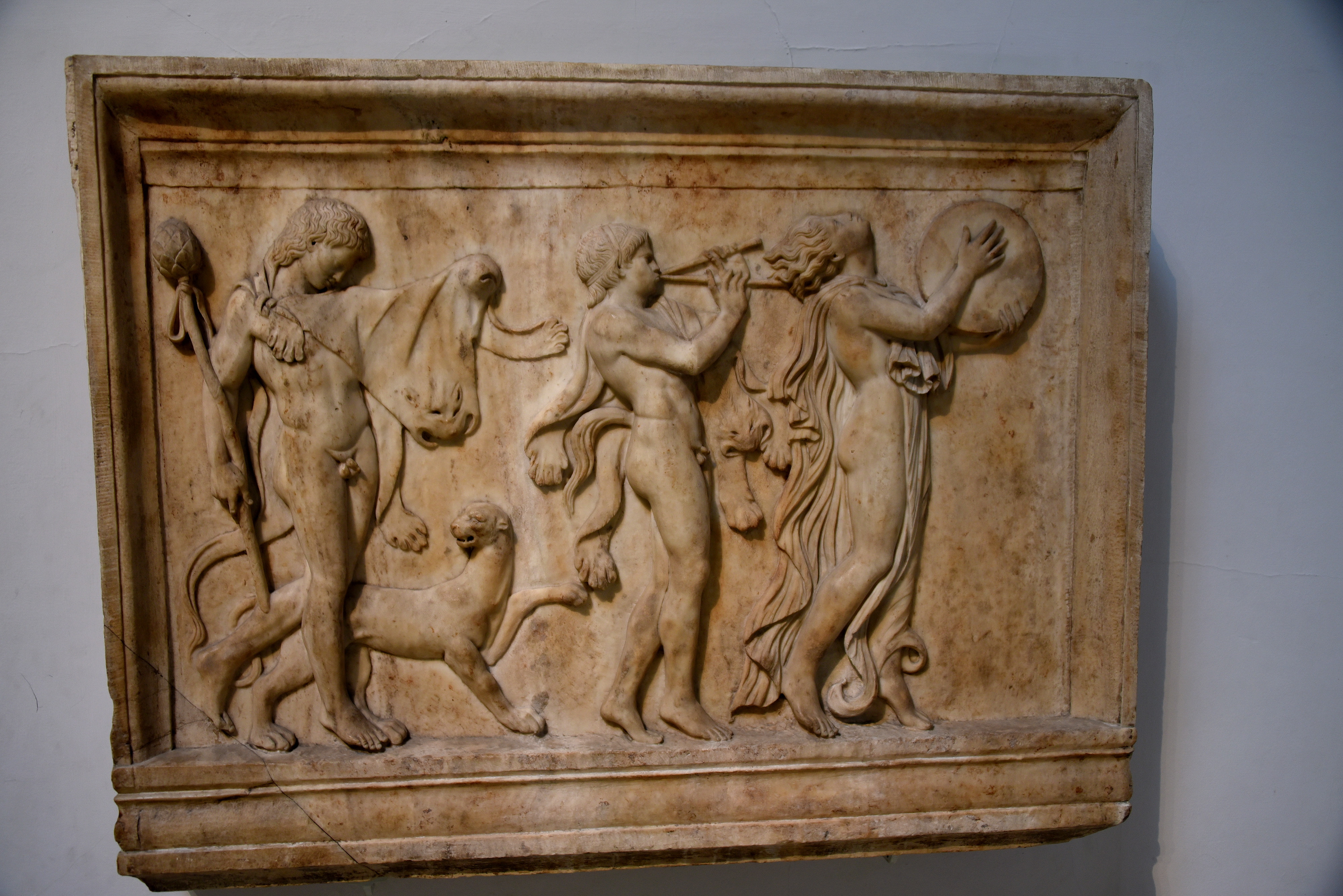 This ecstatic procession features 2 satyrs and a female follower of Dionysos (Bacchus), god of wine. The satyr and maenad at the front play pipes (aulos) and a small drum. The other satyr carries a thyrsos, Dionysos' staff, and is accompanied by a panther, recalling the god's oriental origin. The marble relief was made in the Roman period, but the figures derive from Classical Greek prototypes of the 4th century BCE. From the Villa Quintiliana on the Appian Way, south of Rome. Roman, about 100 CE. (The British Museum, London)