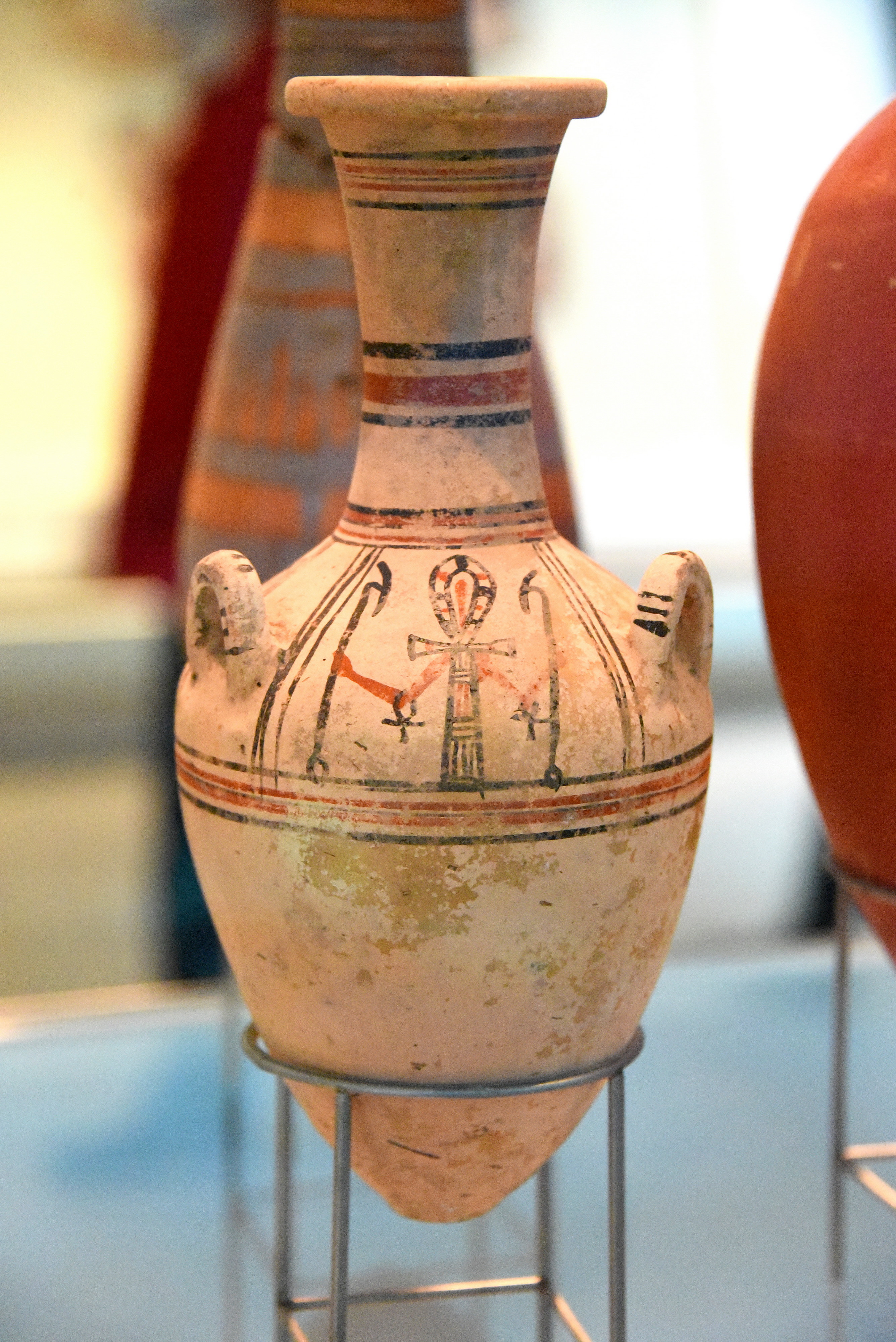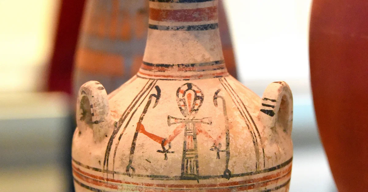 A pottery jar with three painted representations of the ankh sign with 2 arms holding 2 was scepters. From the New Kingdom of Egypt, Ramesside Period, 1292-1069 BCE.