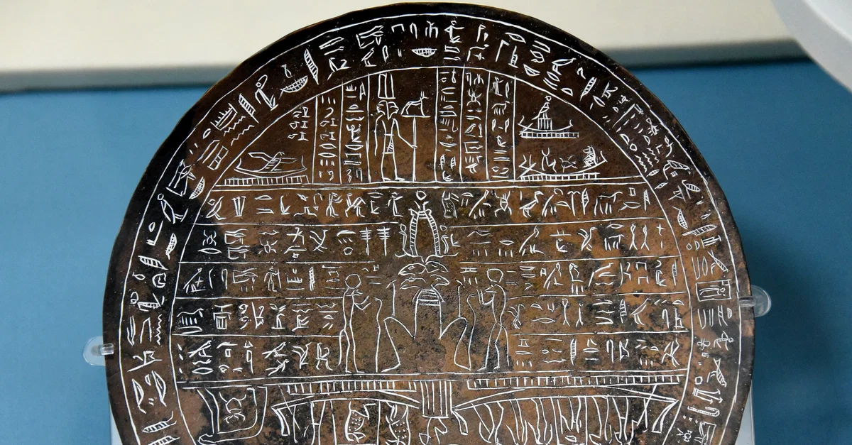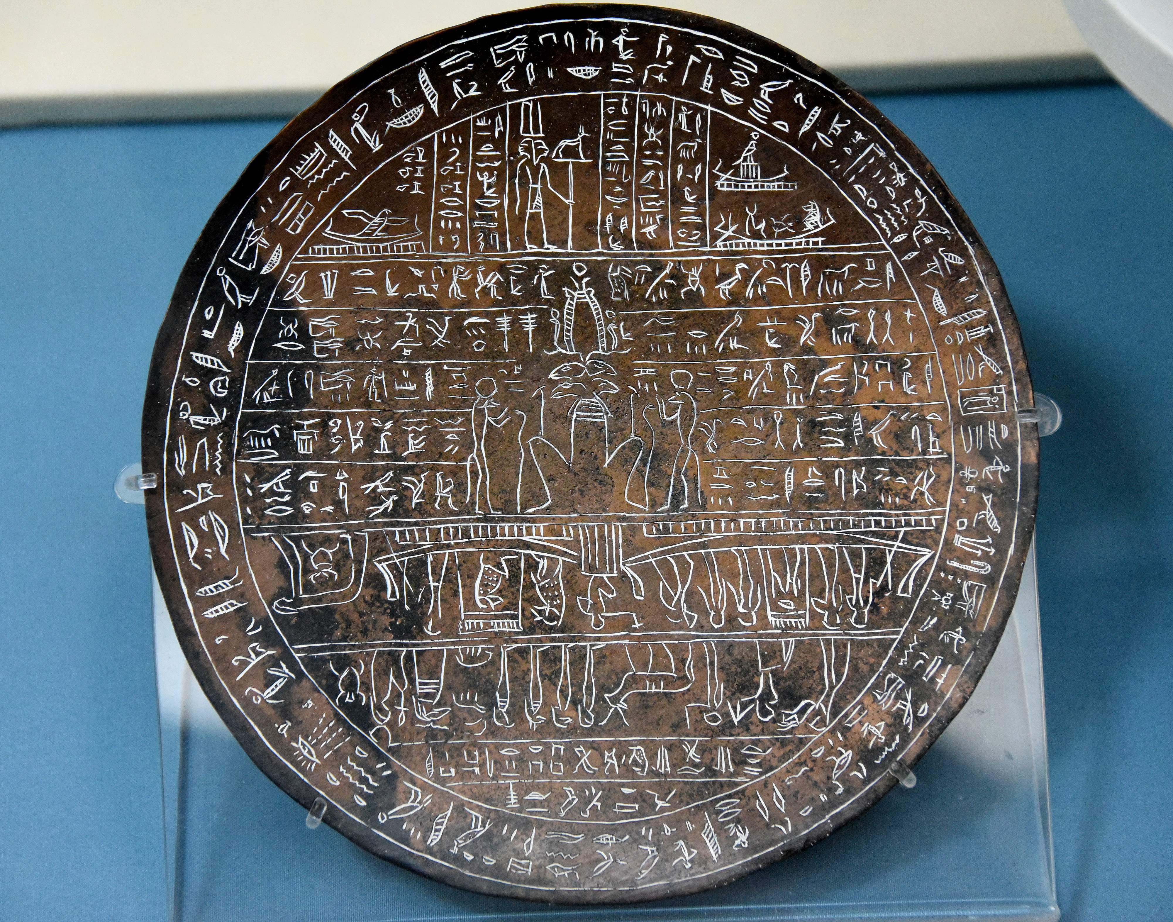 Hypocephali are inscribed discs usually of plastered linen and less frequently of papyrus or bronze, which were placed beneath the heads of mummies in the Late/Ptolemaic Periods. The texts written on them were taken from spell 162 of the Egyptian Book of the Dead and were intended to provide life-giving heat to ensure resurrection of the dead. Images of deities connected with the notion of creative power and renewed life supplemented the potency of the text. At the center of this hypocephalus, we can see the 4-headed ram of Mendes, adorned with baboons. From the Tomb G of Djedhor, cemetery G at Abydos, Egypt. 30th Dynasty, 380-343 BCE. (The British Museum, London)