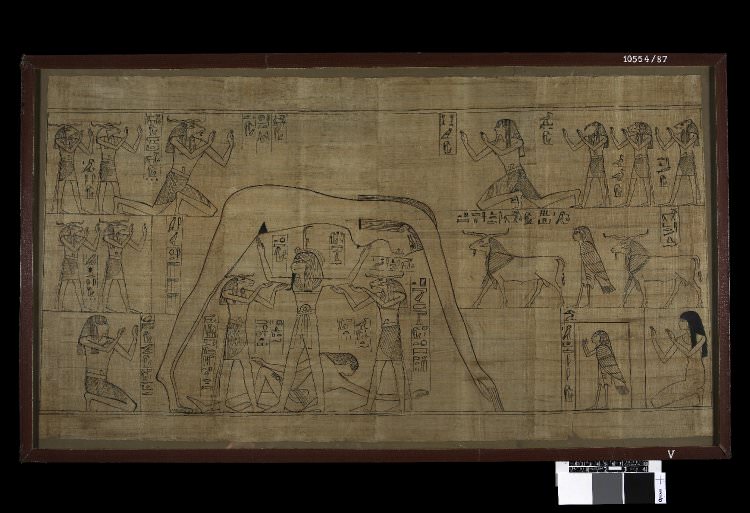 Book of the Dead of Nestanebtasheru (sheet 87): Geb is shown as a semi-recumbent figure stretching out his limbs while the elongated body of Nut arches above him. Her feet touch the ground at the eastern horizon and her fingers at the western horizon. She is supported by a third key figure, Shu, god of the atmosphere, who is aided in his task by two ram-headed deities. Nestanebisheru herself kneels at the right, raising her hands in adoration; her 'ba'-spirit imitates her gesture, and a group of gods accompany her.