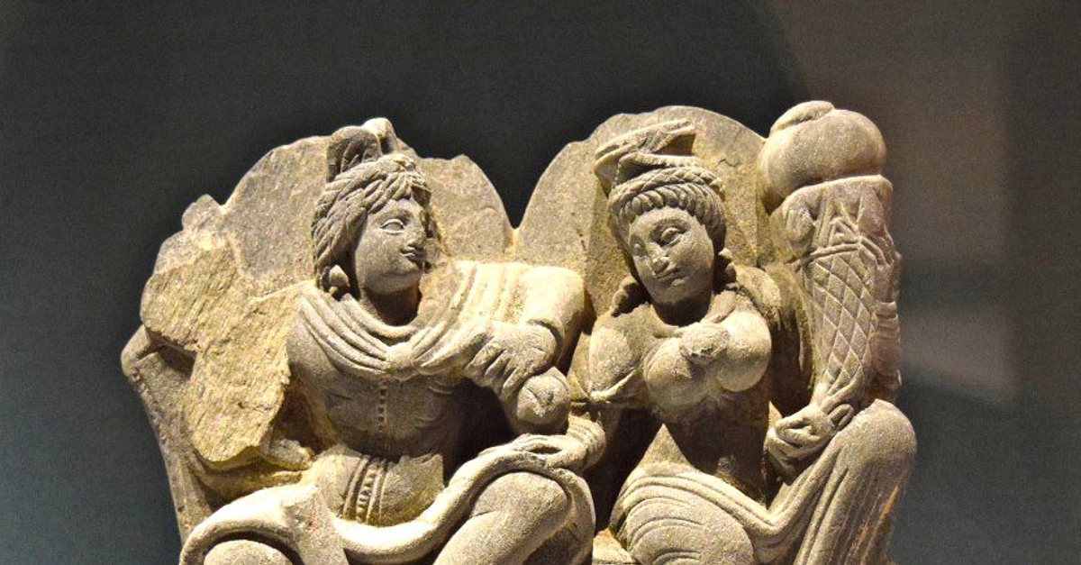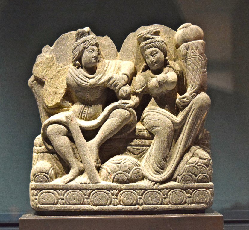 A sculpture from Gandhara depicting Panchika and Hariti (the god of wealth and his wife). The purse and cornucopia suggest the figures may also represent Kubera and Ardochsho. Schist, 100-300 CE. (Ashmolean Museum, Oxford)