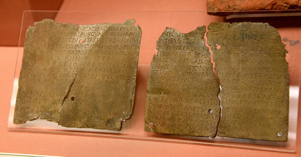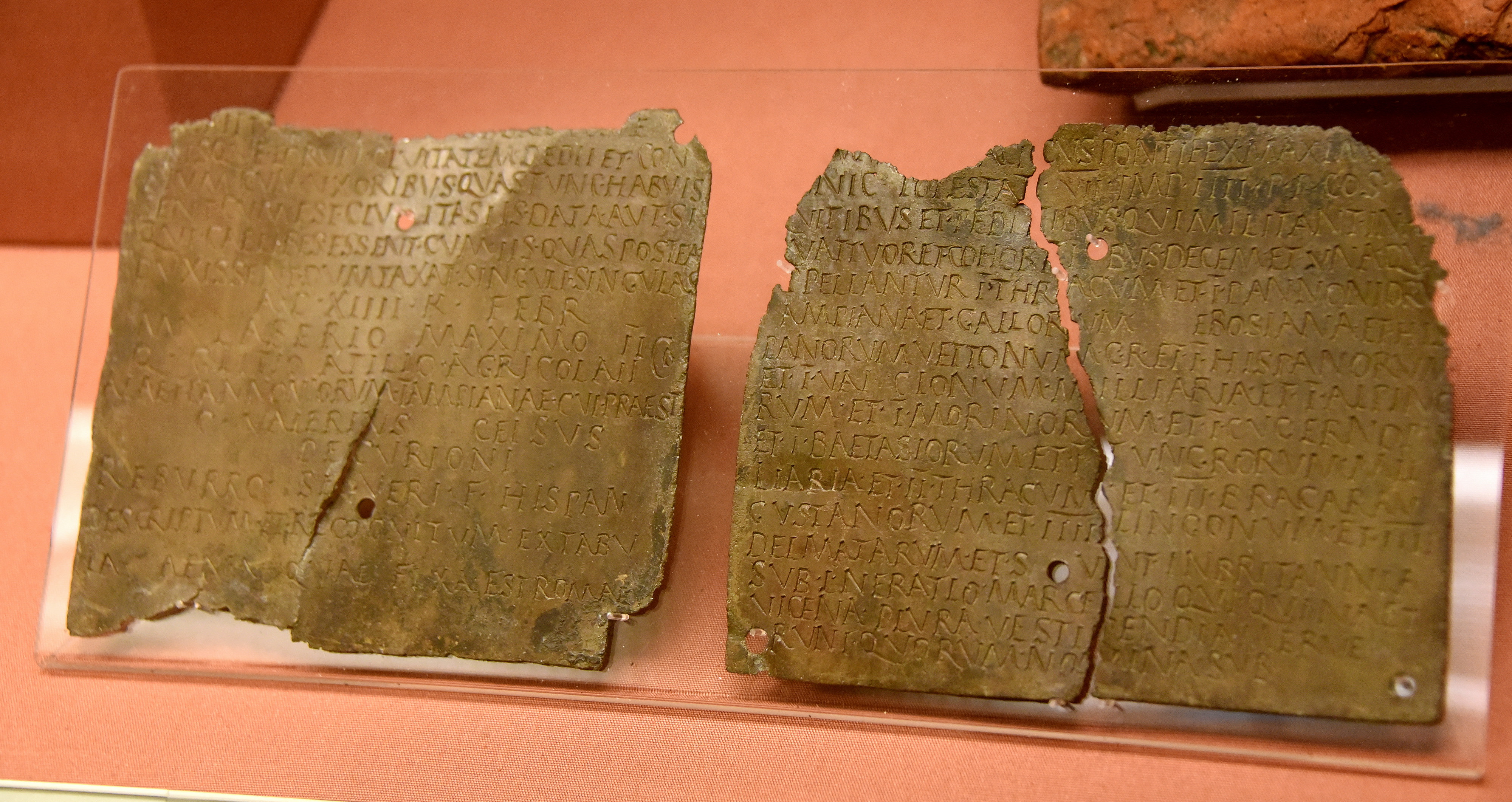 This official military discharge comprising 2 inscribed bronze plates was a copy of a master held in Rome. It was issued by the Emperor Trajan to Reburrus, a Spanish junior officer (decurion) in the 1st Pannonian cavalry regoiment. The certificate was a precious possession that granted citizenship and the right to marry. From Malpas, Cheshire, circa 103 CE. (The British Museum, London)