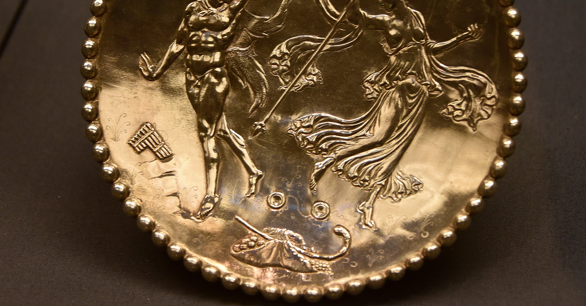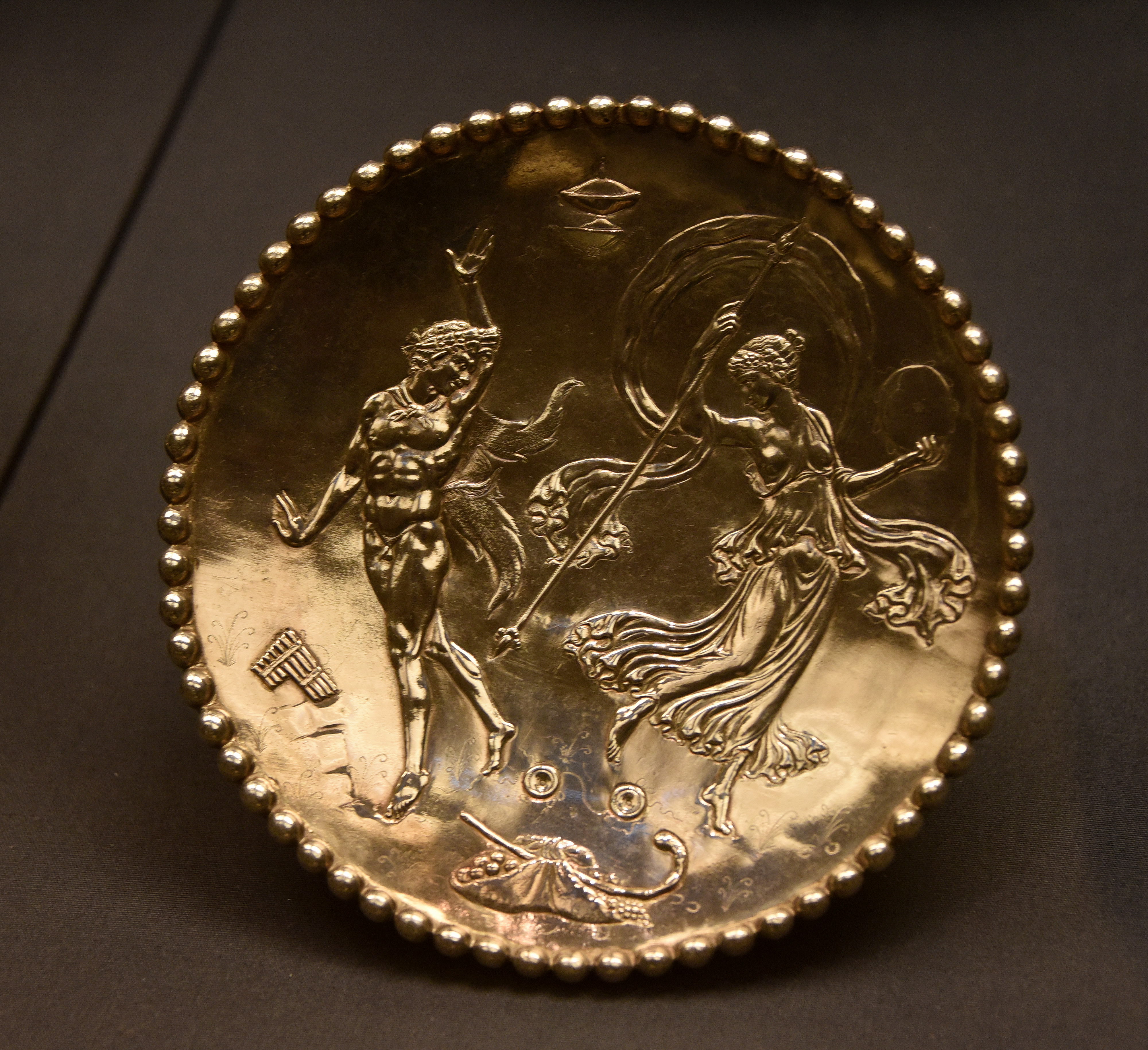 This small dish or platter (one of a pair) with a Bacchic scene is closely related in style and subject to the Mildenhall Great Dish itself. Both show Maenads (female followers of Bacchus) dancing and playing musical instruments, in one case accompanied by the god Pan, and in the other by a young satyr. The name Eutherios, written in Greek and in the genitive (possessive) case is scratched deeply on the underside of each dish within the foot-ring. From the UK. 4th century CE. (The British Museum, London)