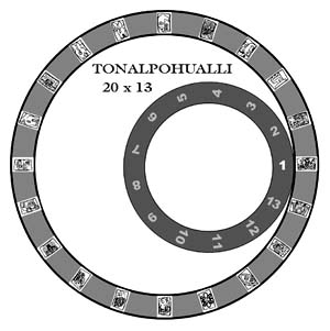 A representation of the Tonalpohualli – ‘Counting of the Days’ 260-day calendar used by ancient Mesoamerican cultures. Two systems ran simultaneously with a group of 13 numbered days combined with a group of 20 name days. Thus, each day had a unique combination of day and number.