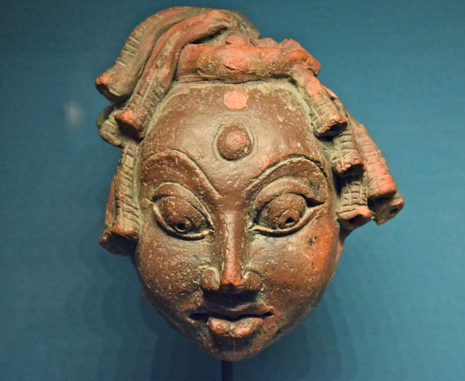 A terracotta head of Shiva. He has the matted hair of an ascetic and on his forehead is the third eye of wisdom. 400-500 CE, northern India. (Ashmolean Museum, Oxford)