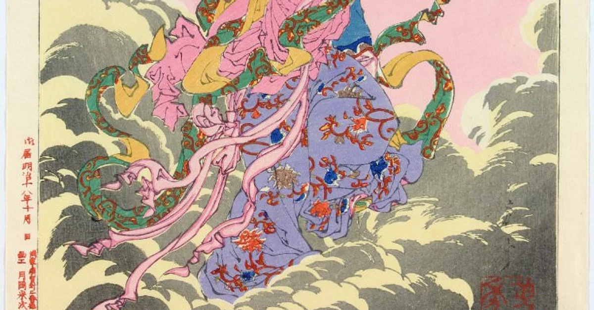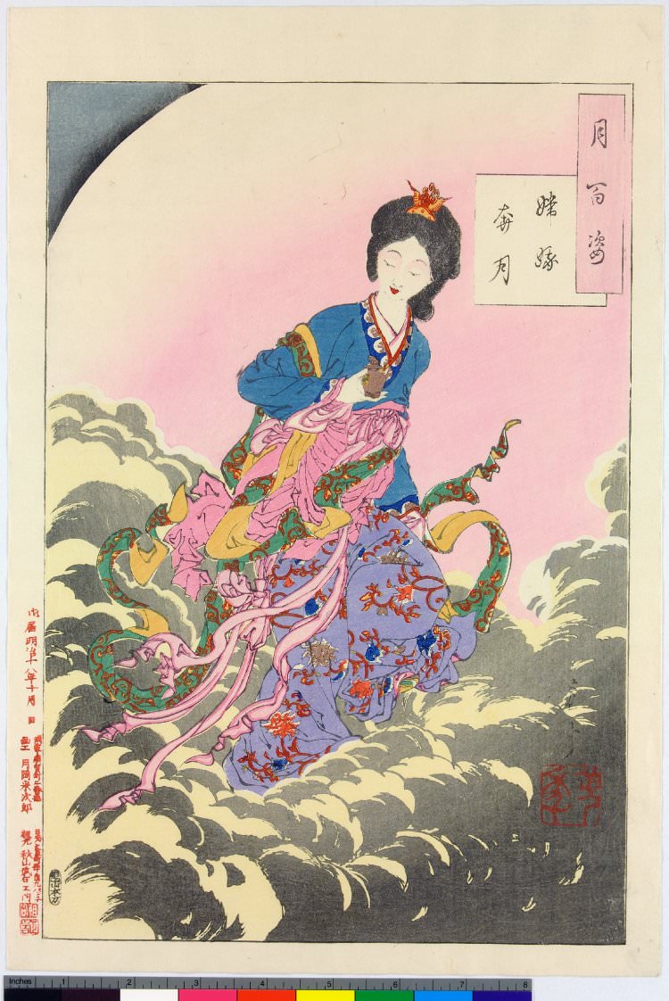 Colour woodblock print by Yoshitoshi from 19th century CE Japan, showing the Chinese woman Chang'e journeying to the moon, where she becomes the deity Xi Wang Mu, the "Queen Mother of the West".