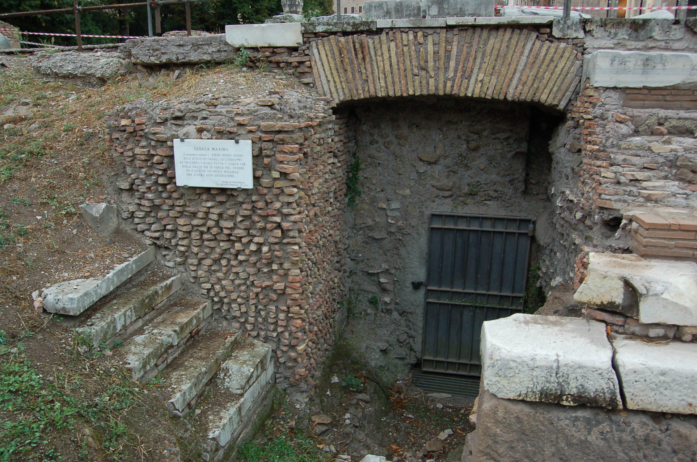 The site of the main sewer, called the Cloaca Maxima located in the Forum Romanum. Believed to be drained around 600 BCE by Tarquinius Priscus, the draining of the area between the Palatine, Capitoline, Esquiline & the Viminal Hills led to the establishment of the Forum Romanum and helped to promote the growth of the city of Rome itself. One of the original public works projects of western civilization.