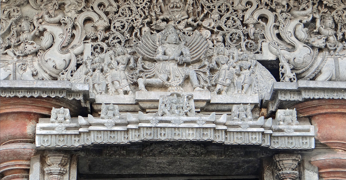 Bas relief of Garuda on the top of a door in Chennakesava Temple in Belur. It was built during the reign of the Hoysalas (1026 CE – 1343 CE).