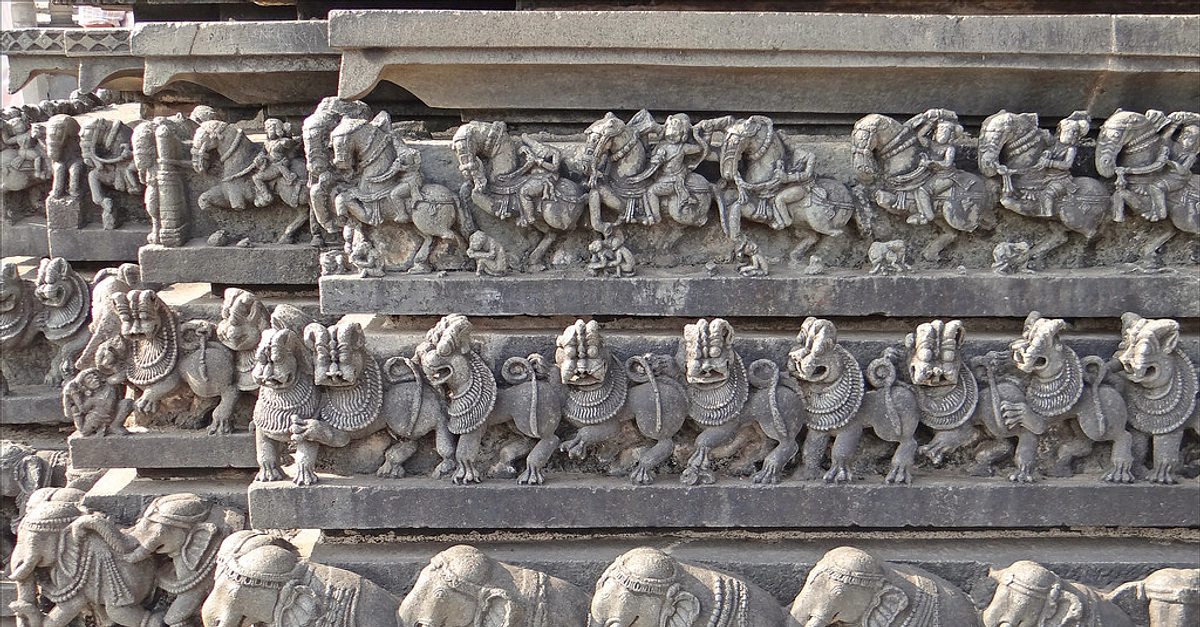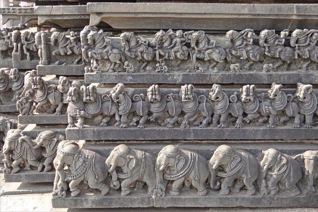 Intricate relief sculptures at the base of Chennakesava Temple in Belur built in Hoysala period (1026 CE – 1343 CE).