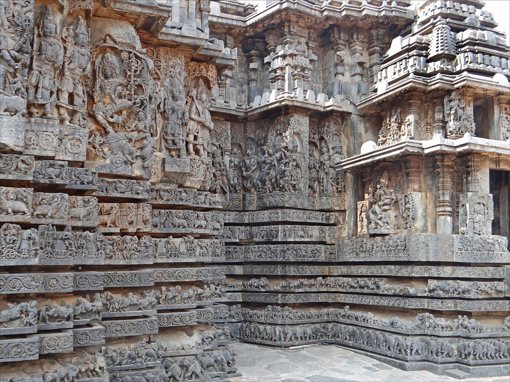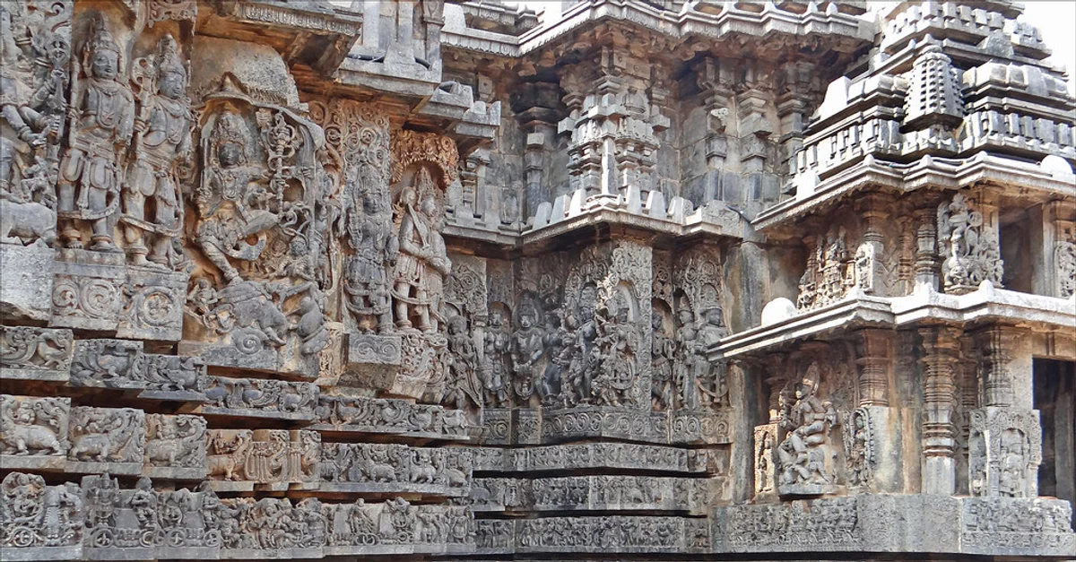 Intricate carvings on the temple walls of Hoysaleswara Temple in Halebidu built by the Hoysalas (1026 CE – 1343 CE).