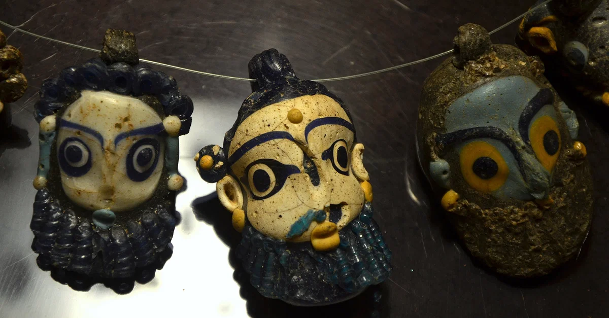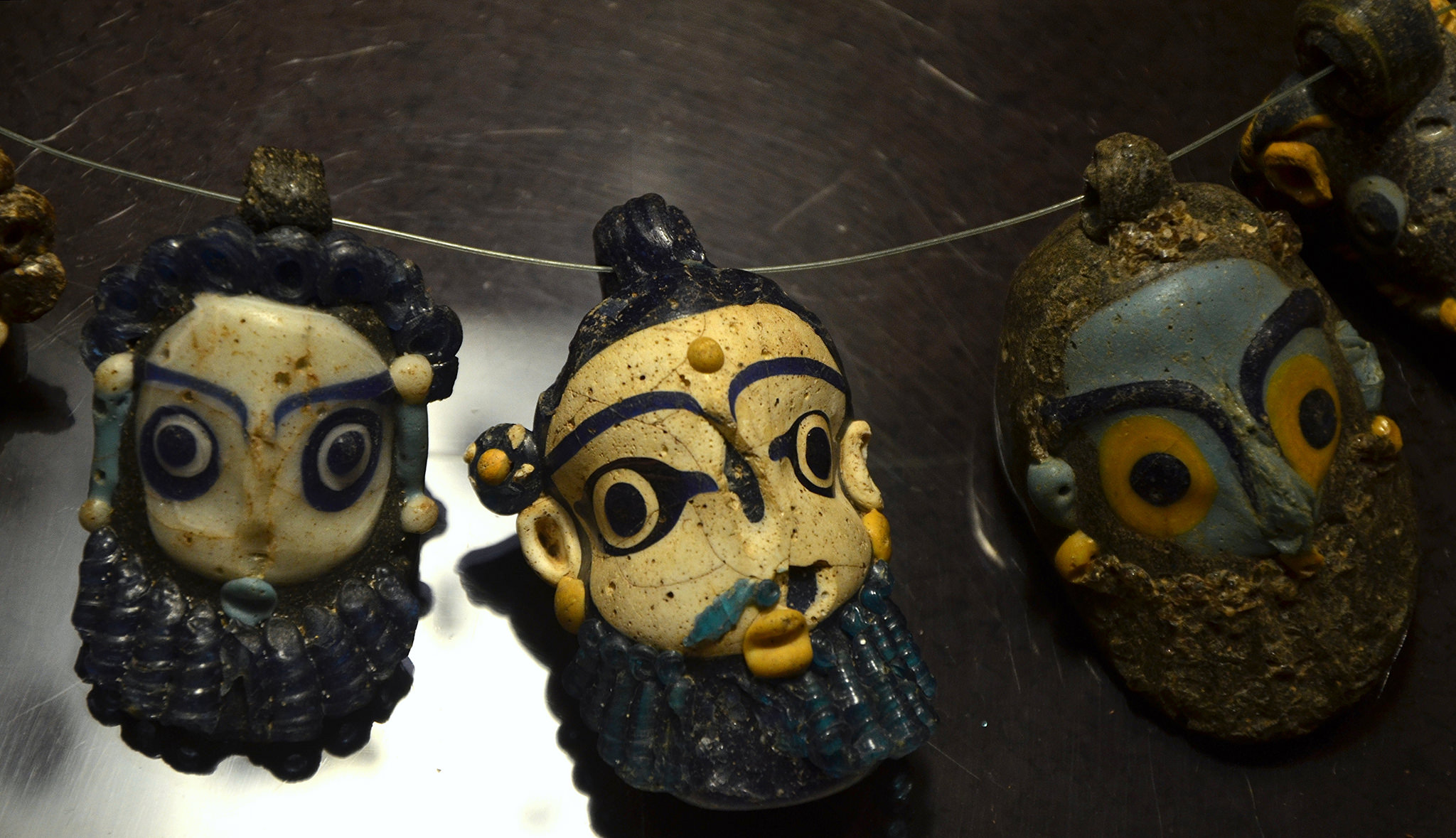 Phoenician or Carthaginian amulets in the form of bearded heads made of sand-core glass, 4th-3rd century BCE (Cagliari, Museo Archeologico Nazionale).