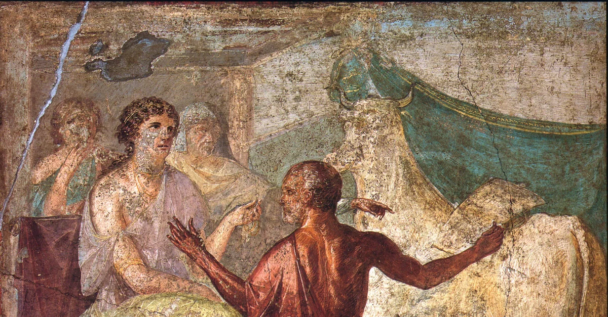 A Roman wall painting depicting Daedalus and Pasiphaë, wife of King Minos of Crete. In Greek mythology, Daedalus made the queen a wooden bull so that she might wait inside it to attract the attention of a bull she was in love with. The offspring of this union was the Minotaur. Daedalus' son Icarus is shown at a workbench. From the House of the Vettii, Pompeii, 1st century CE.