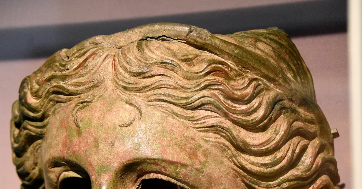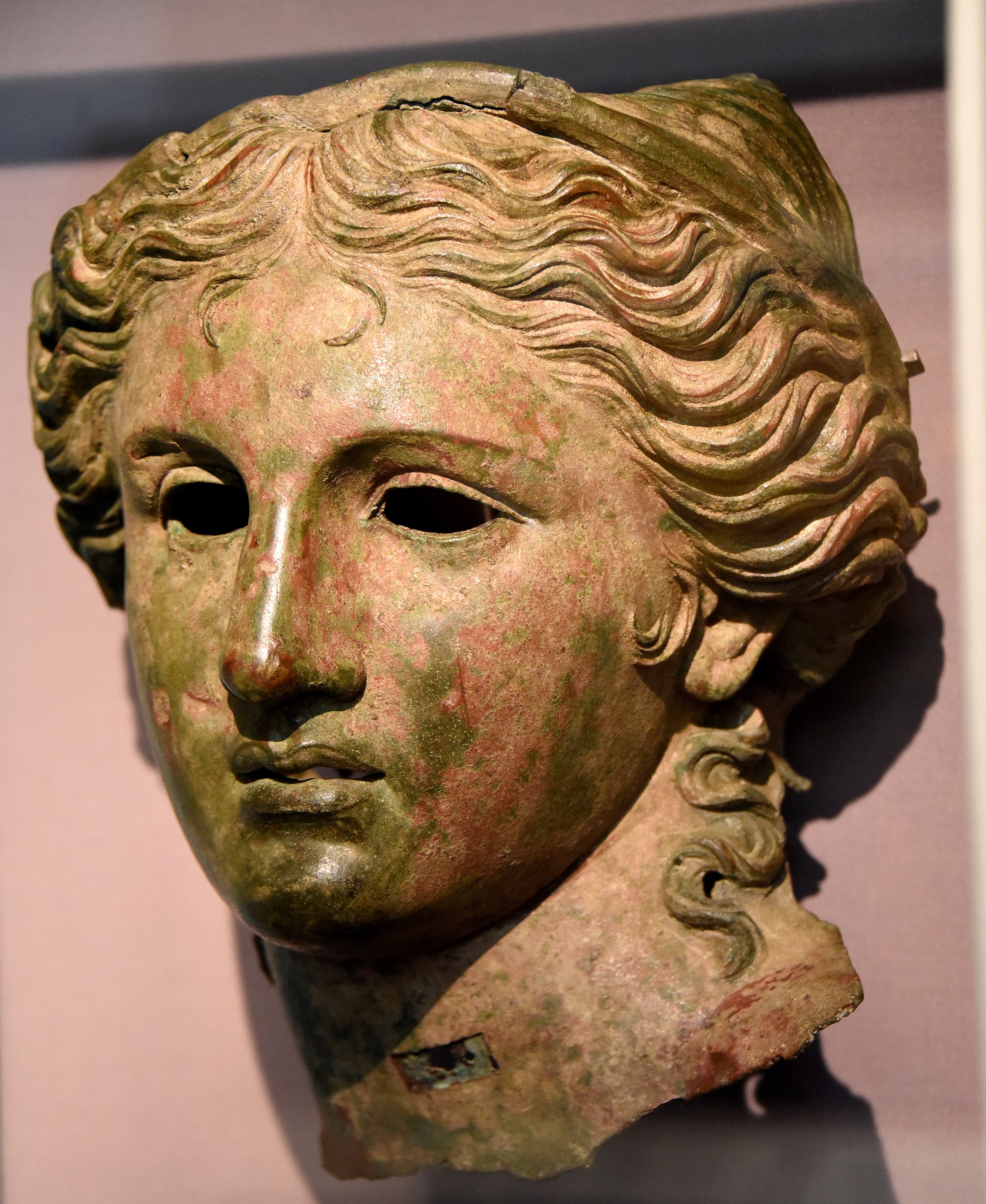 Head from a bronze cult statue of Anahita, a local goddess shown here in the guise of Aphrodite. From Satala, Armenia minor, c. 200-100 BCE.