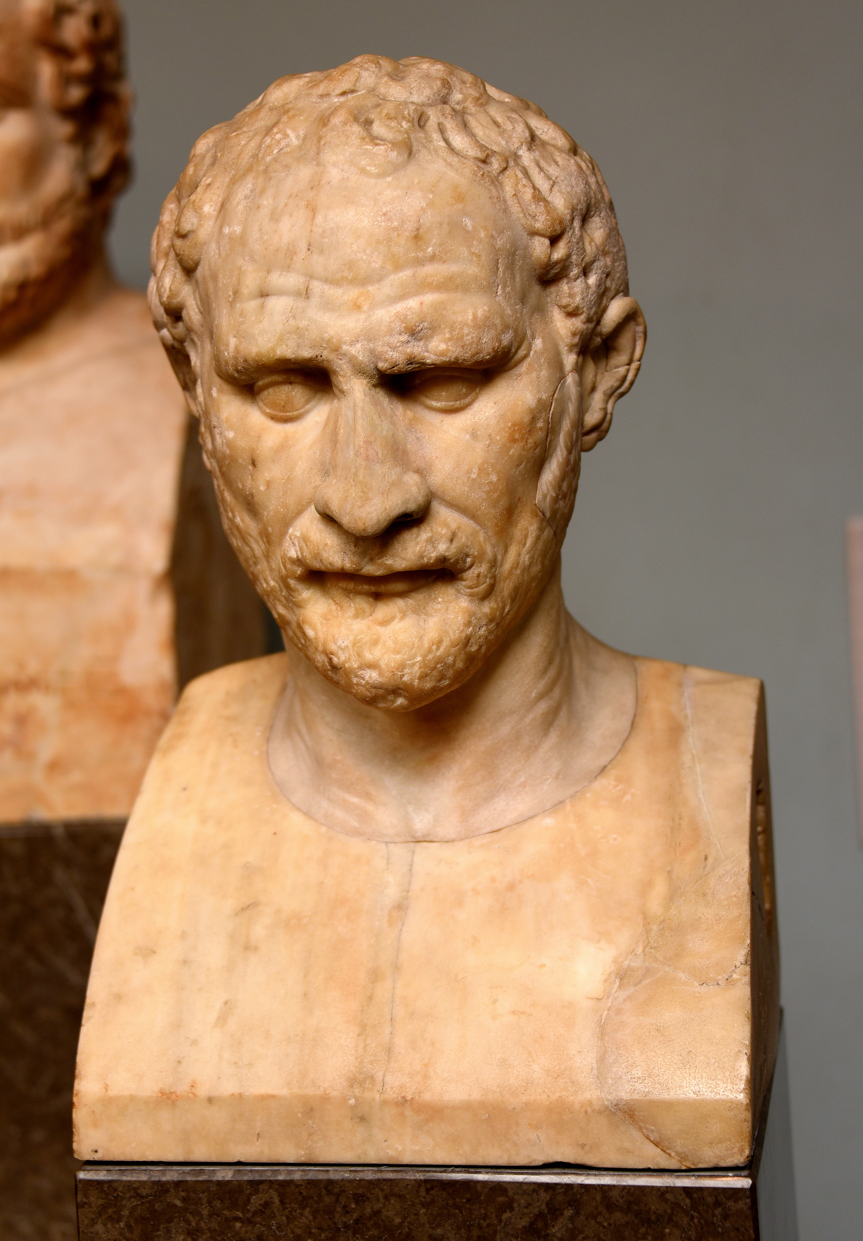 This head came from a Roman copy of a statue of him by Polyeuktos erected in the Athenian market-place in 280 BCE, 42 years after his death. The knitted brow and compression of the lips suggest the inner struggle of a troubled mind. (British Museum, London)