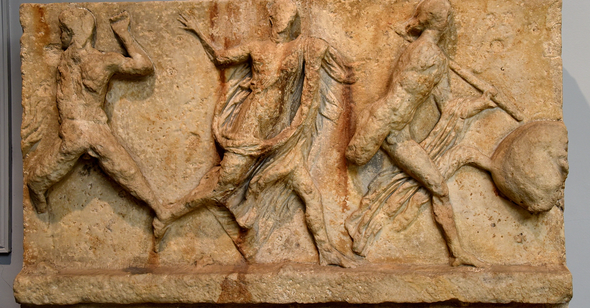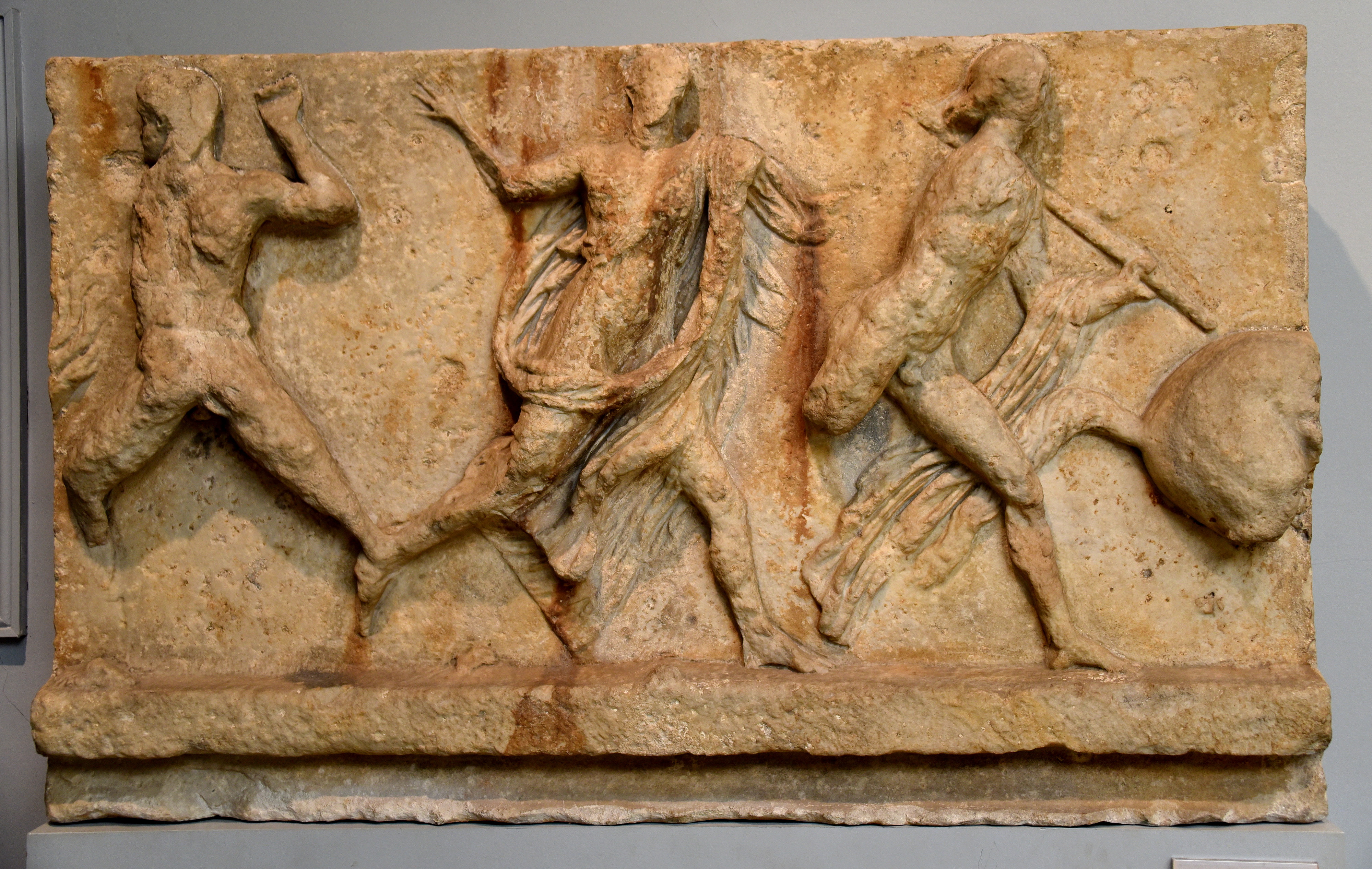 This is a marble slab of the so-called Centaur frieze of the Mausoleum at Halicarnassus, also known as the Tomb of Mausolus. The whole frieze depicts a violent conflict between Greeks and Centaurs. Here on this slab, we can recognize 3 figures; 2 Greeks and a woman, and parts of two Centaurs. The woman is depicted wearing a chiton belted at the waist and a himation; her right breast is bare. This representation of the woman's clothing may suggest that she had been assaulted by a Centaur but has escaped or been rescued. The Centaurs were invited to the wedding of the Lapith king Perithoos, but they became inebriated and tried to carry off the Lapith woman. A violent battle ensured after then. Found built into the walls of the castle of St Peter, Bodrum. Circa 350 BCE. (The British Museum, London)