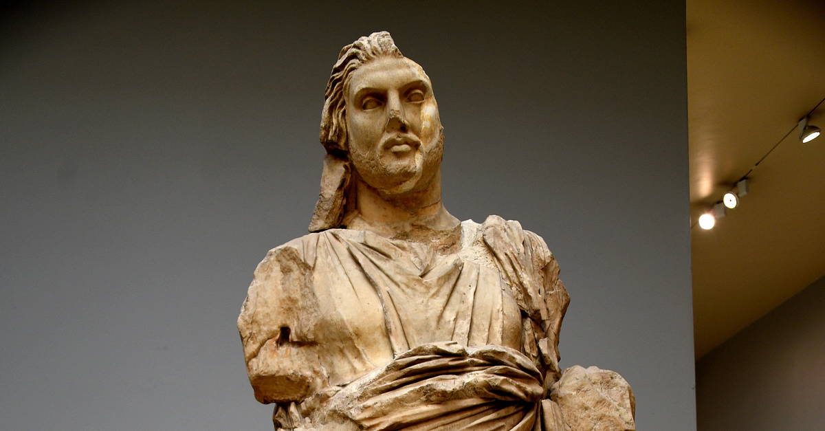 Marble statue of a man from the Mausoleum at Halicarnassus, also known as the Tomb of Mausolus. Identified as Mausolus, king of Caria. From the main sculptural deposit, north of the north wall of the Peribolus. Classical Greek Period, circa 350 BCE. (The British Museum, London)